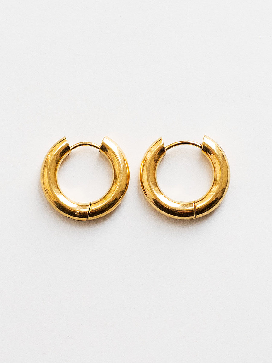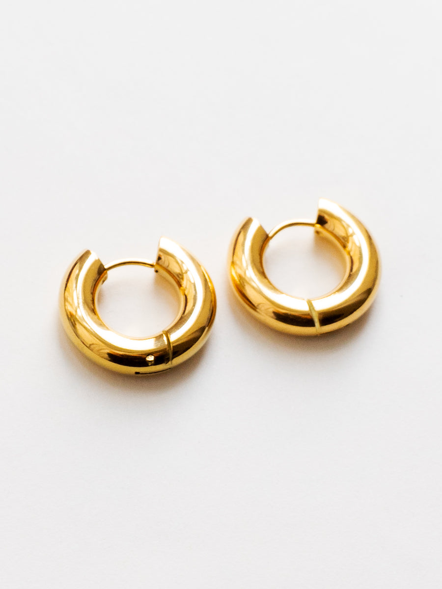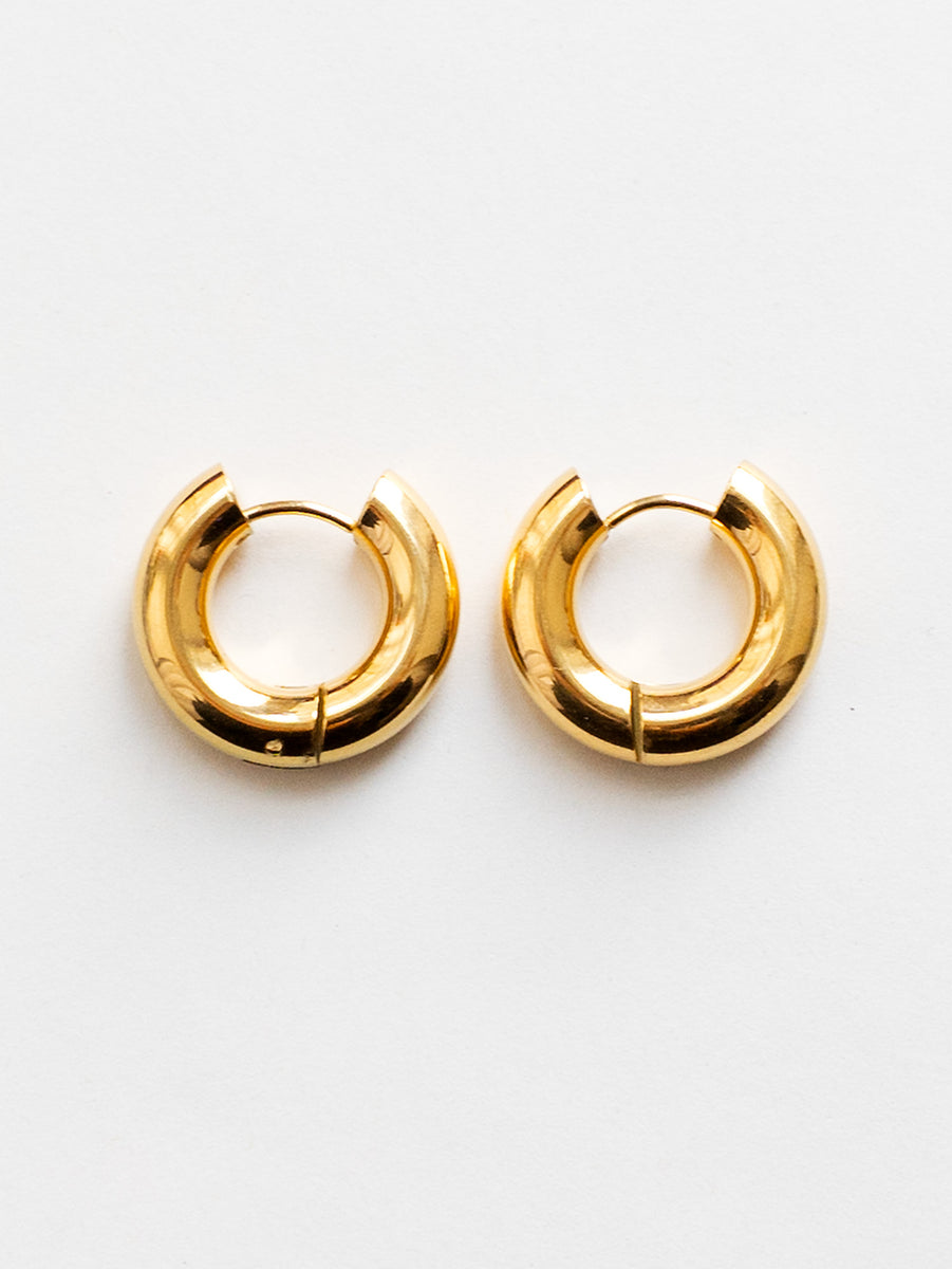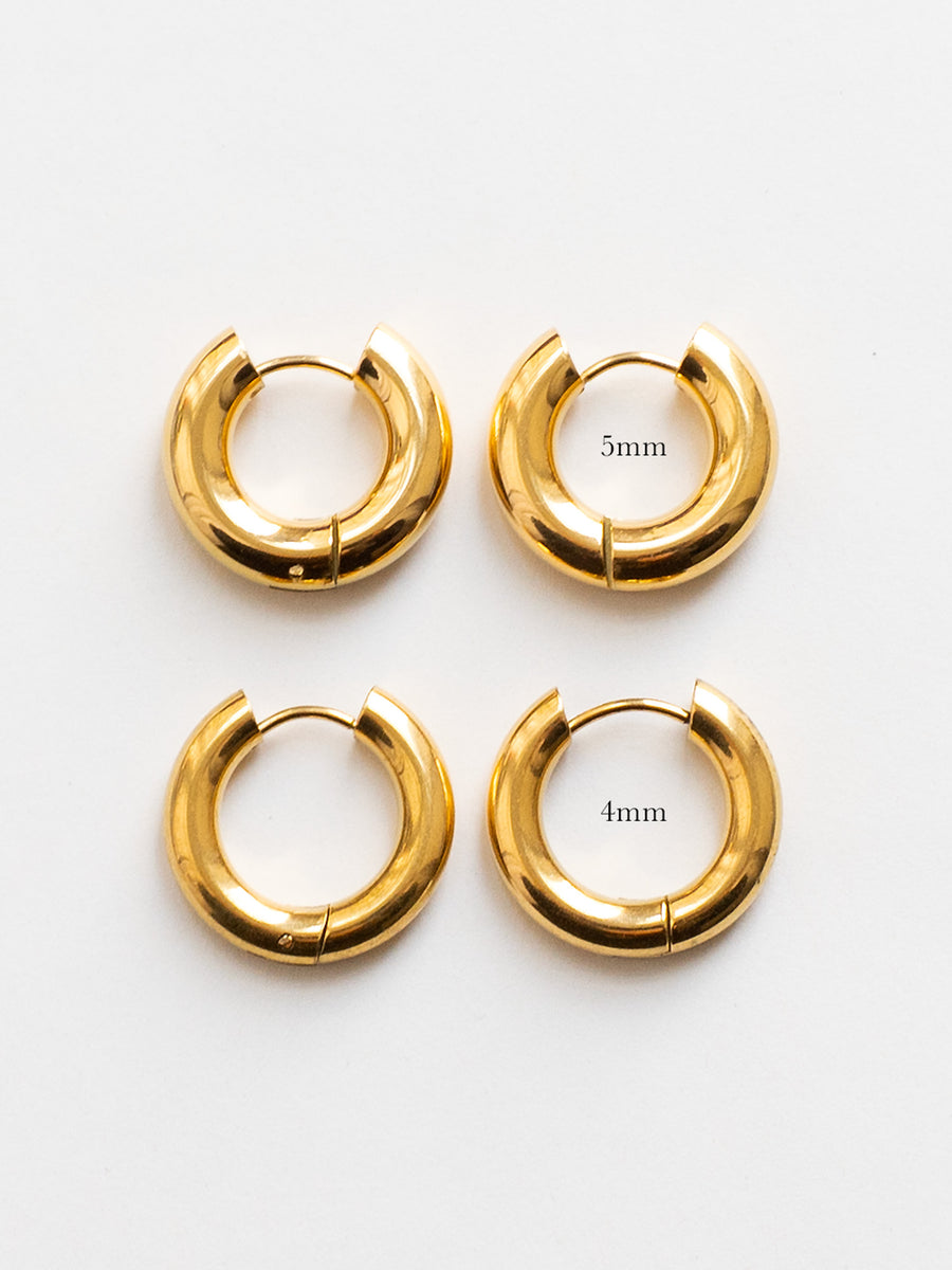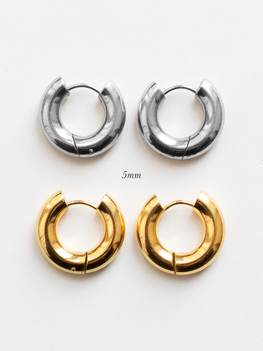Chic chunky hoops with a bold 5mm profile, crafted from durable stainless steel and finished in 18k gold plating or polished silver.