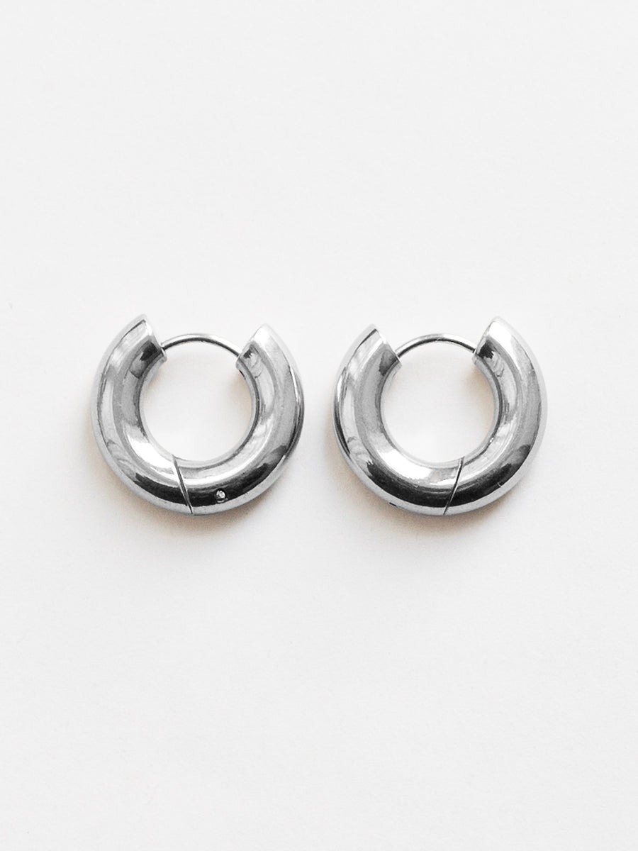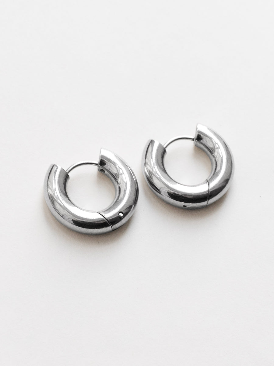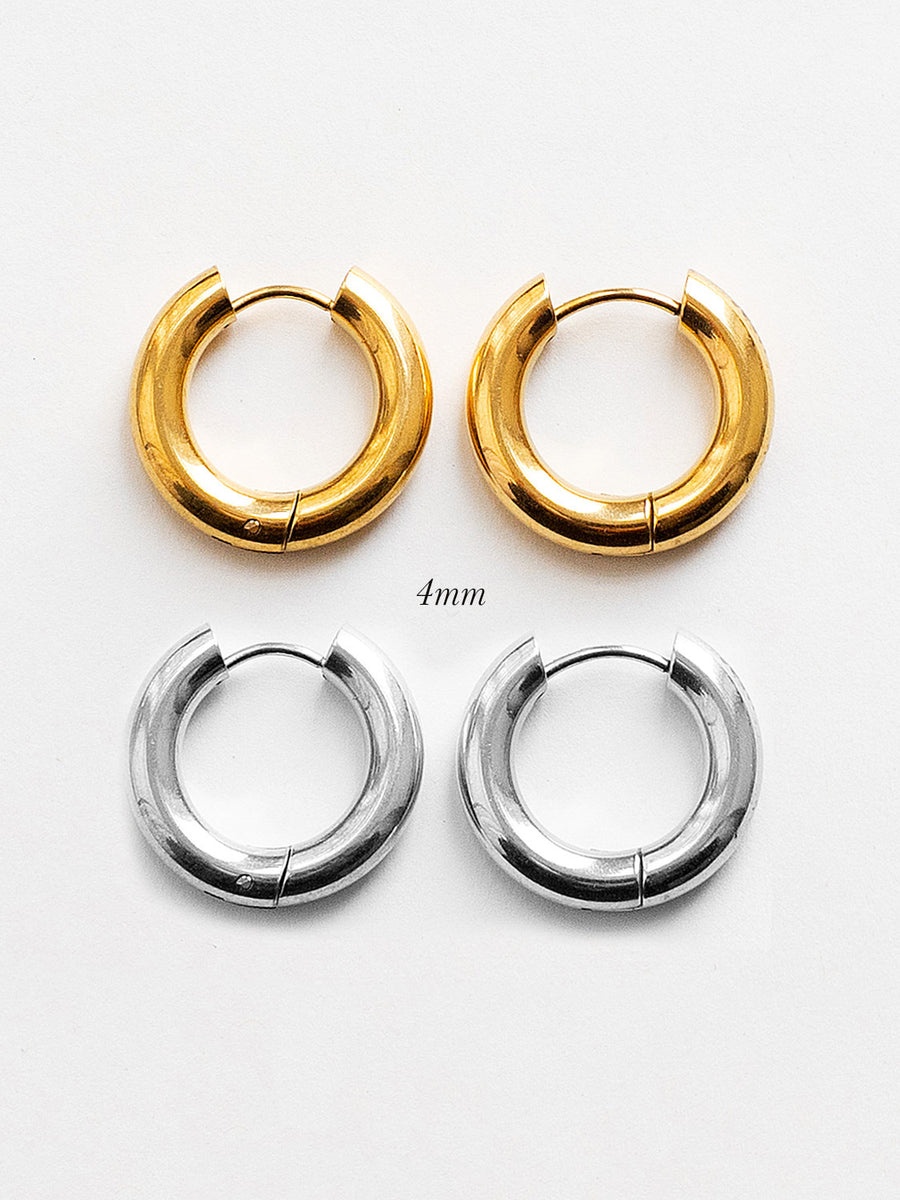 Chic chunky hoops with a bold 4mm profile, crafted from durable stainless steel and finished in 18k gold plating or polished silver.