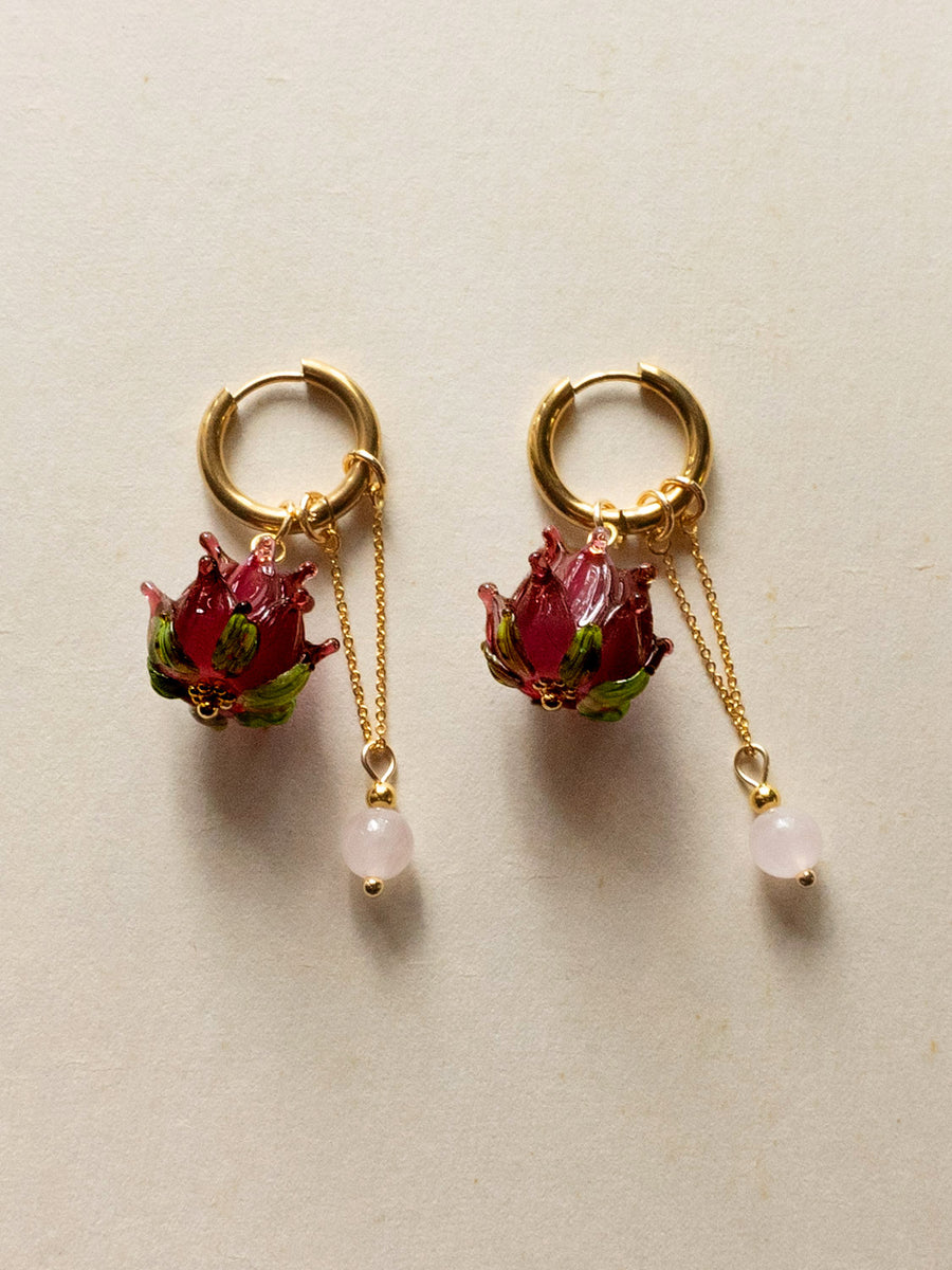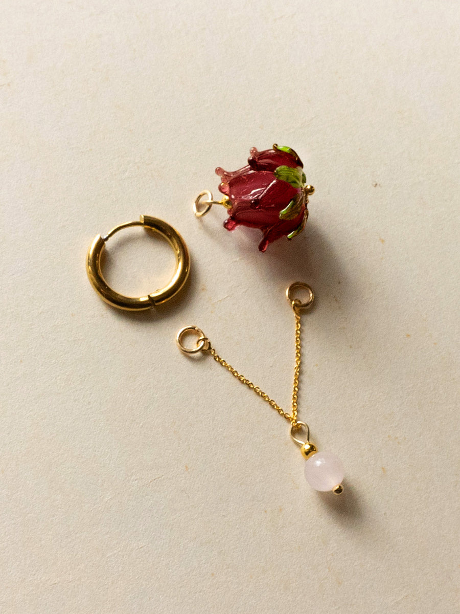 Dreamy and versatile, these gold hoops feature removable charms—delicate glass lotus flowers and delicate pink rose quartz crystals. A graceful balance of romance and play, perfect for switching up your style. (Note: Due to its handmade nature and use of natural stones, variations in colour and tone of glass and crystal portions may be expected.)