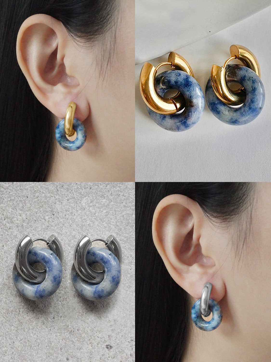 - 18K Gold-plated Stainless Steel (Gold Hoops), Stainless Steel (Silver Hoops), Natural Stone Crystal, Ceramic
