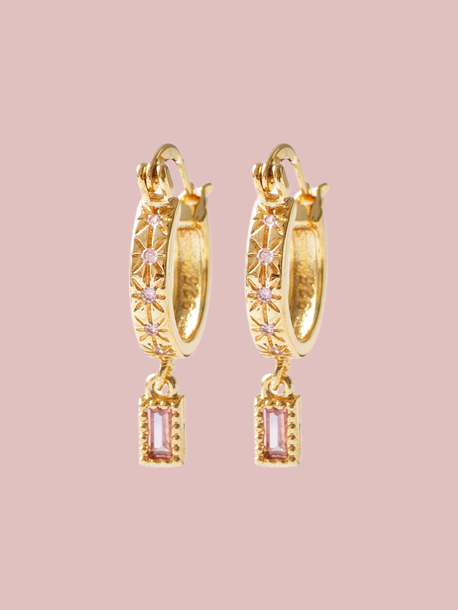 Intricate S925 hoops with a starburst shimmer and sleek gemstone drop for effortless divine energy. Comes in assorted colours.