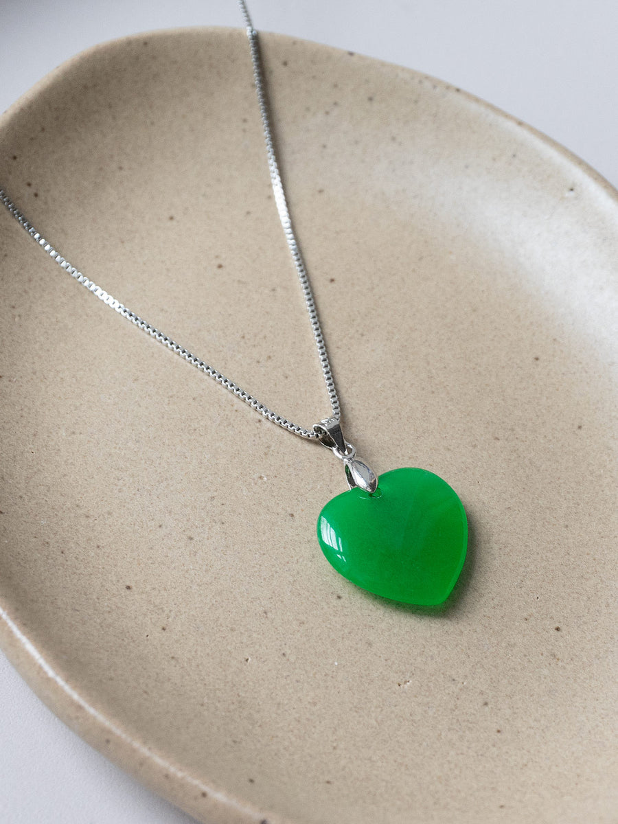 Carved heart jade pendant set in silver, blending soft symbolism with a clean, modern finish. Also available in Gold.