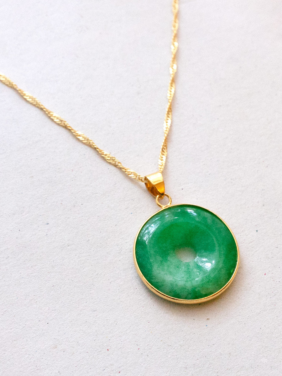 An elegant, bold necklace featuring a large green jade donut pendant designed to make a statement — rich in symbolism and powerful in presence.