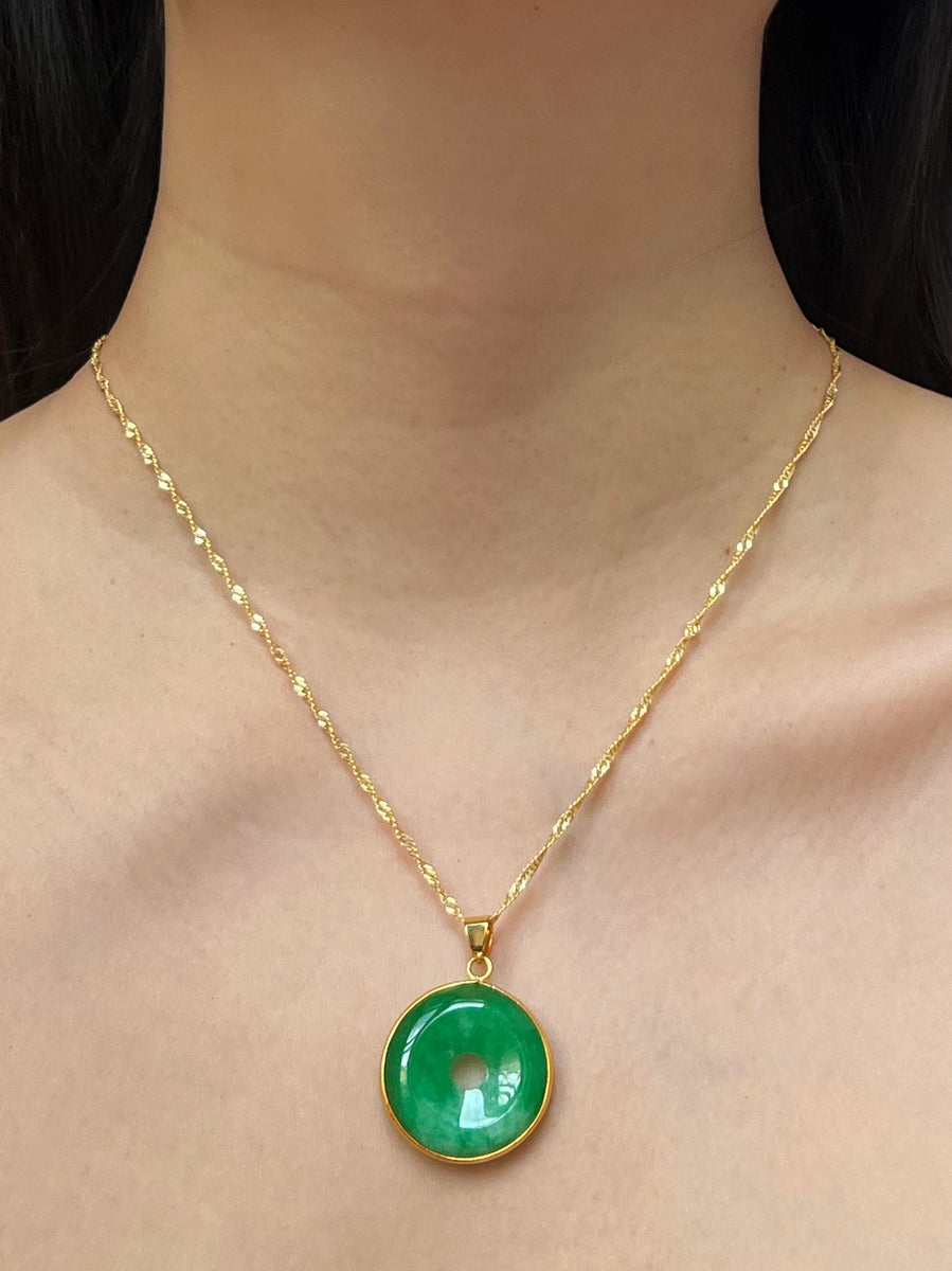 A luxurious jade donut necklace featuring an imperial green jade pendant that's adorned with the powerful symbolism of abundance, longevity, and good luck.