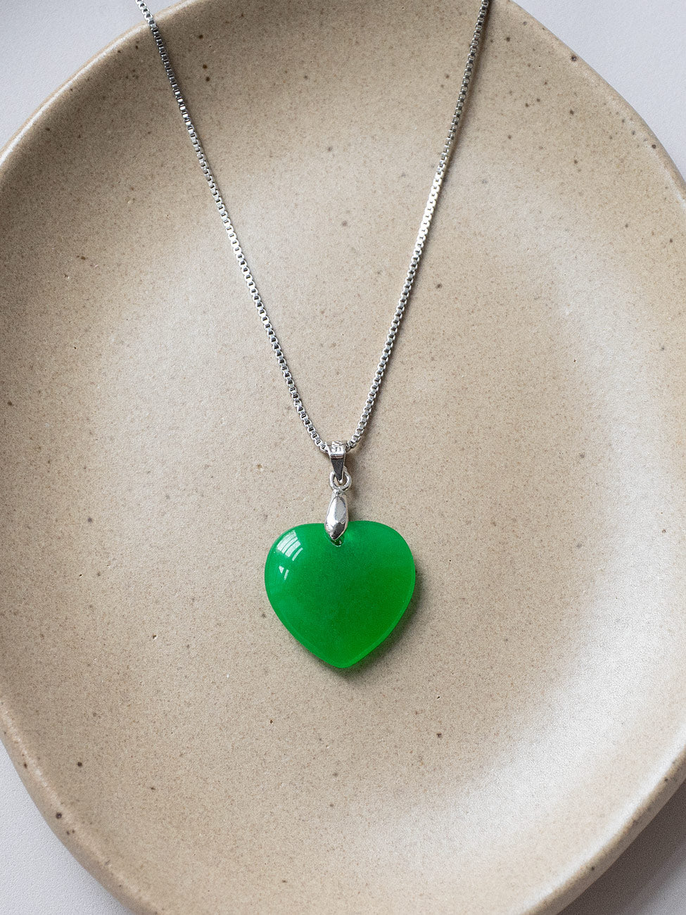 Carved heart jade pendant set in silver, blending soft symbolism with a clean, modern finish. Also available in Gold.