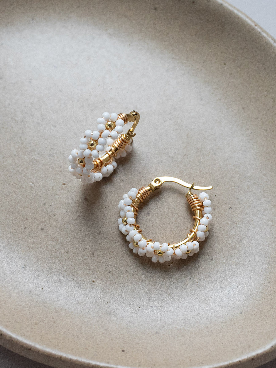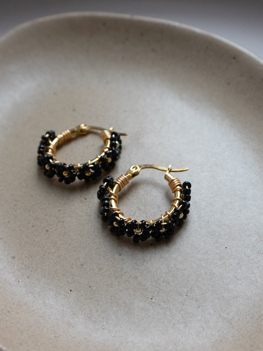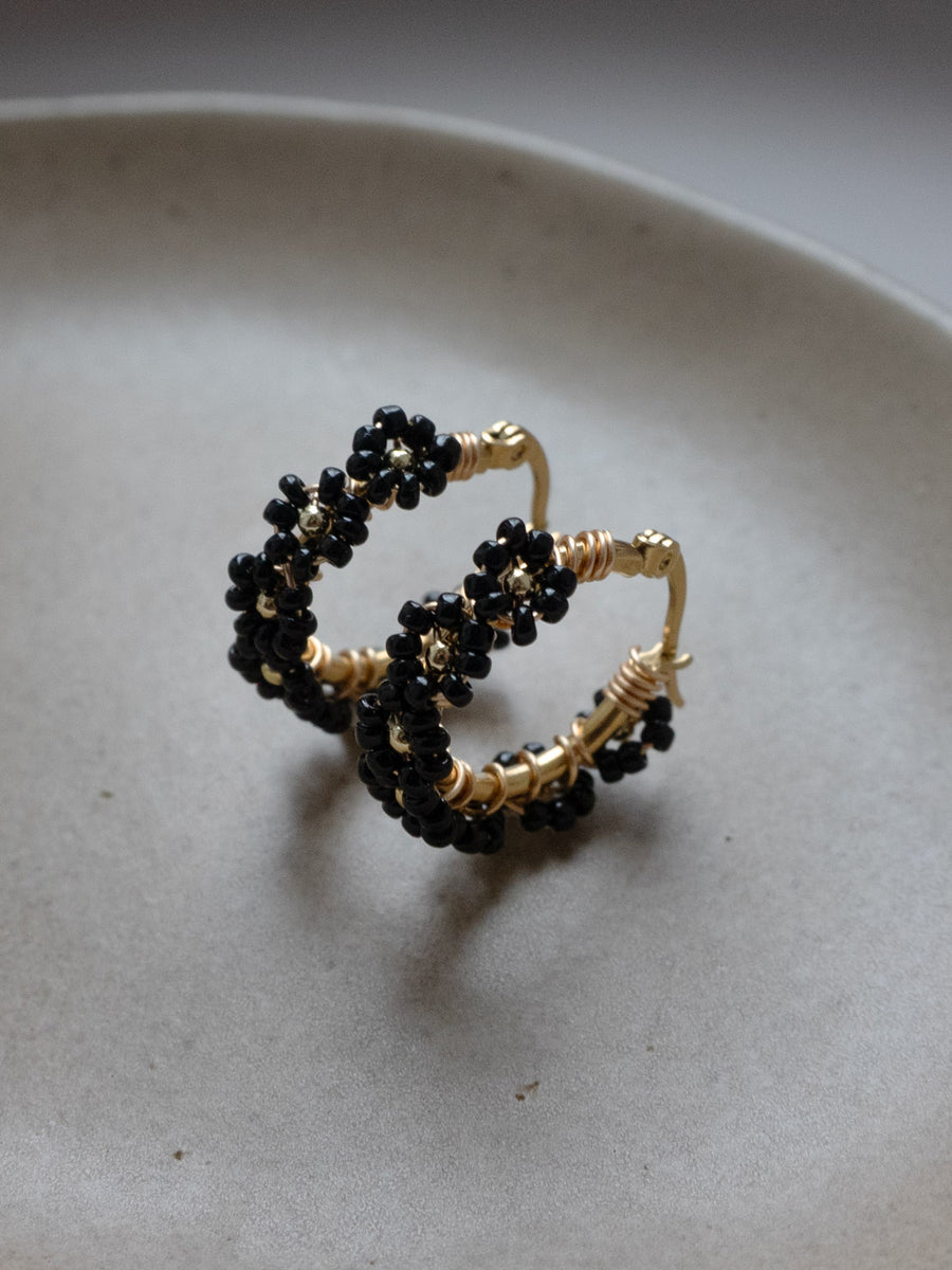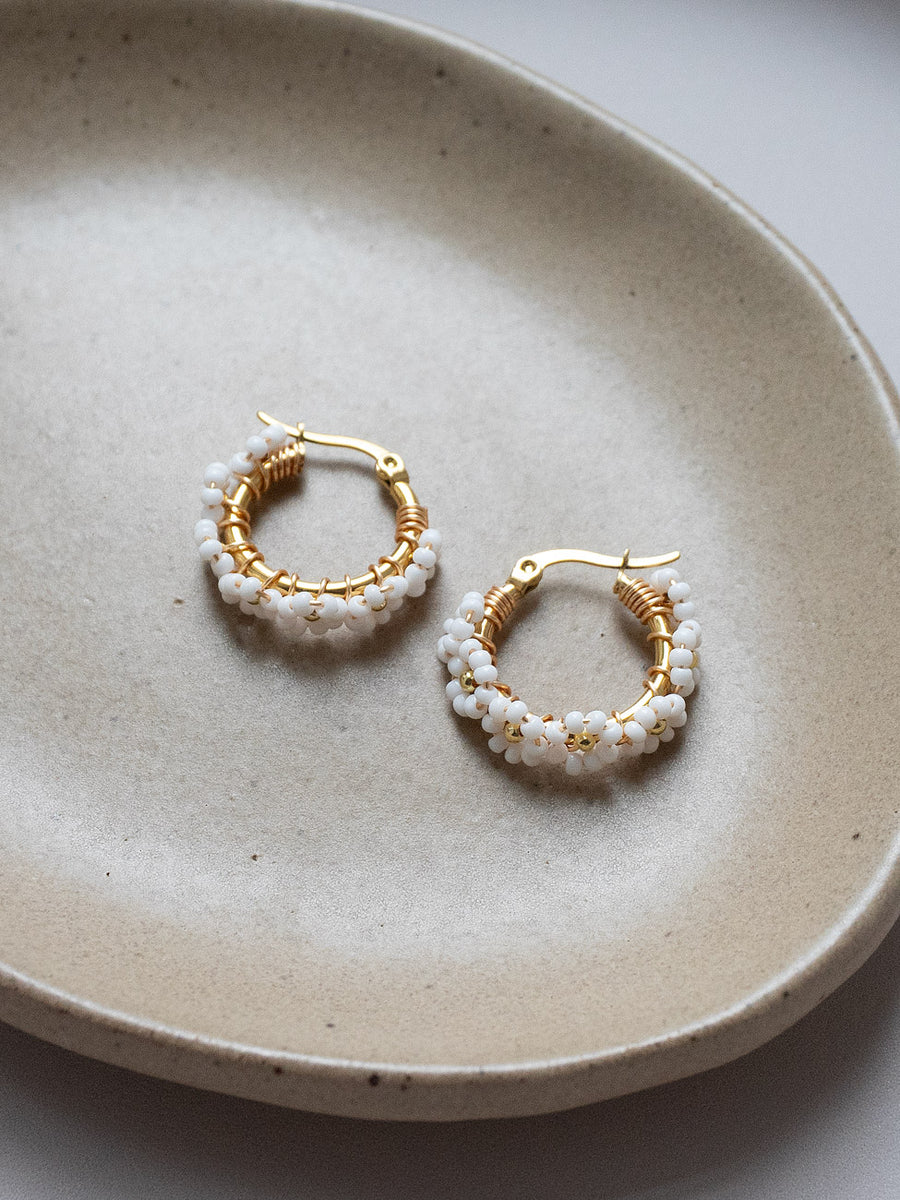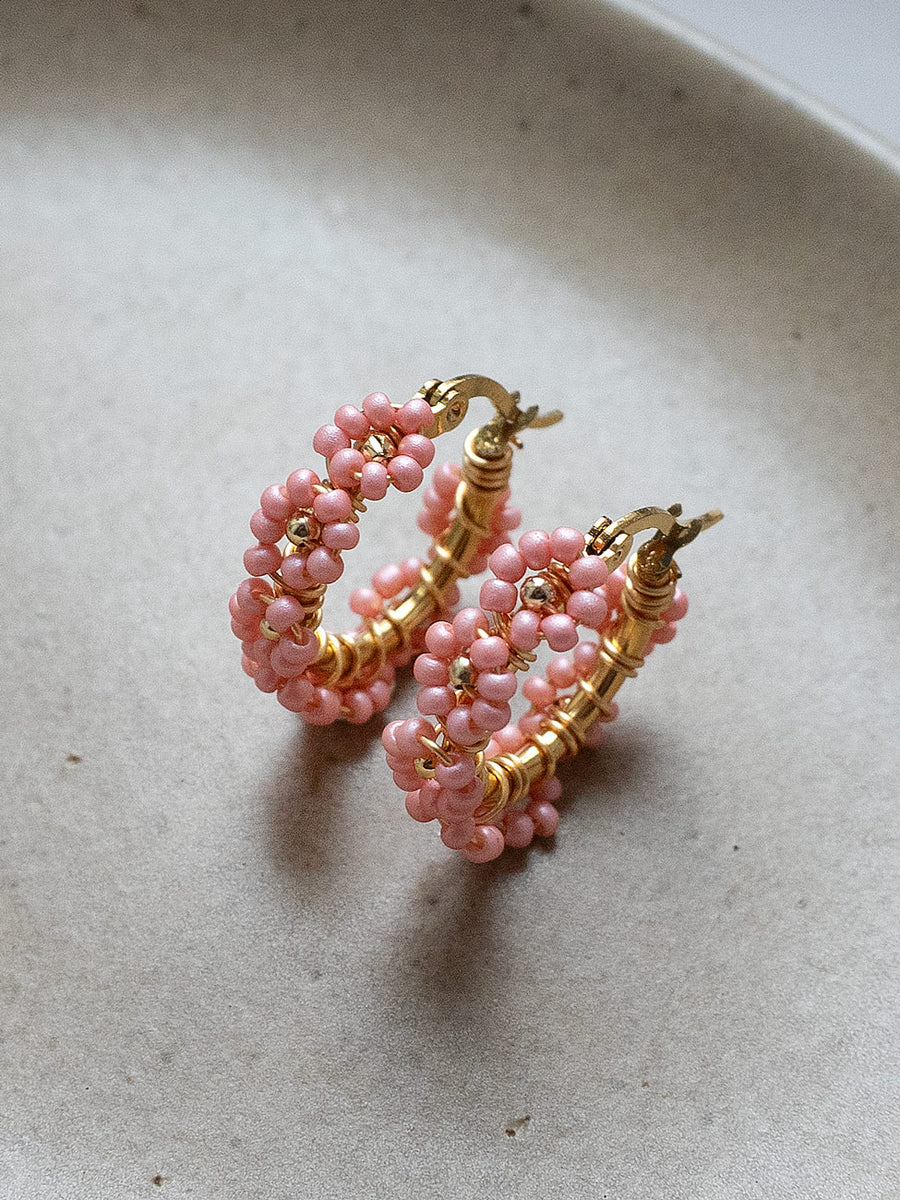 Petite gold stainless steel hoops encircled with tiny hand-beaded flowers, bringing a soft pop of color and charm.