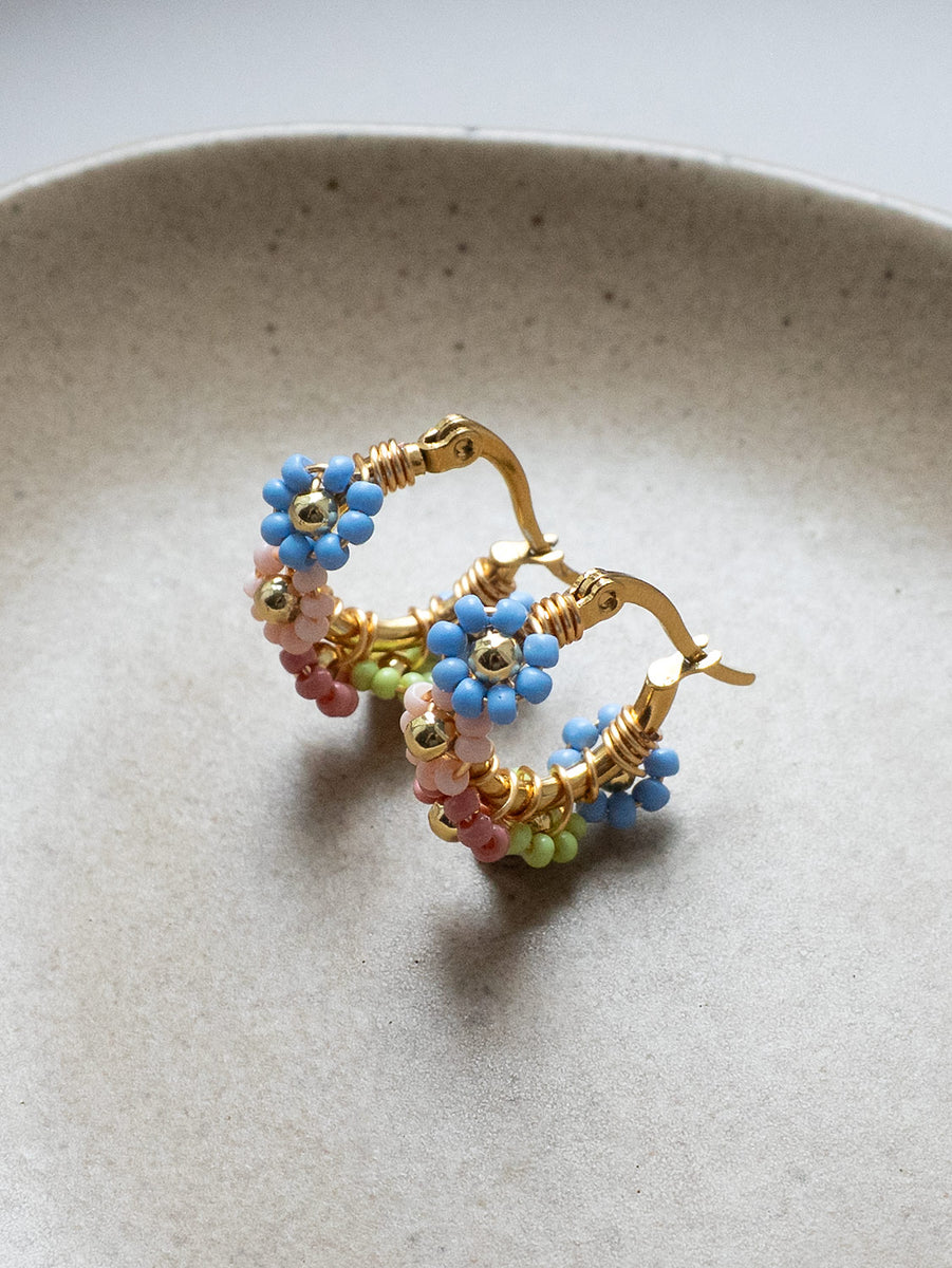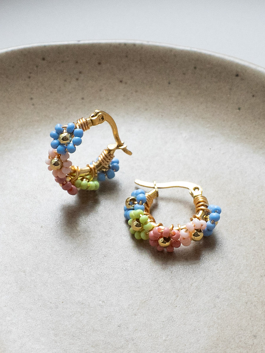 Petite gold stainless steel hoops encircled with pastel hand-beaded flowers, bringing a soft pop of color and charm.