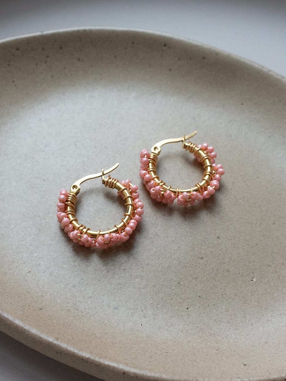 NEWPetite gold stainless steel hoops encircled with tiny hand-beaded flowers, bringing a soft pop of color and charm.