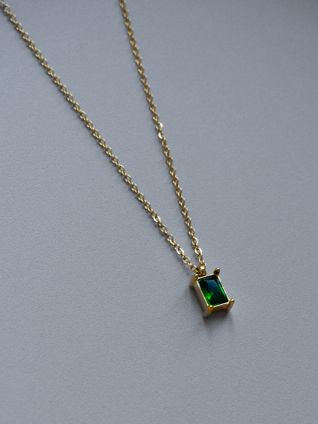 A timeless, gold-plated stainless steel necklace featuring a striking emerald green gemstone that adds a refined pop of color.