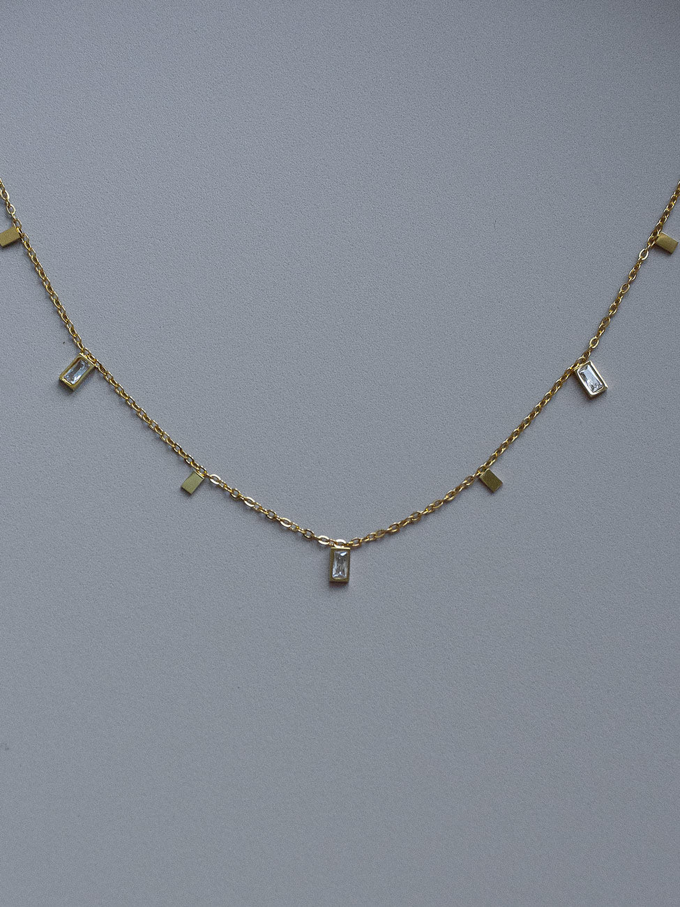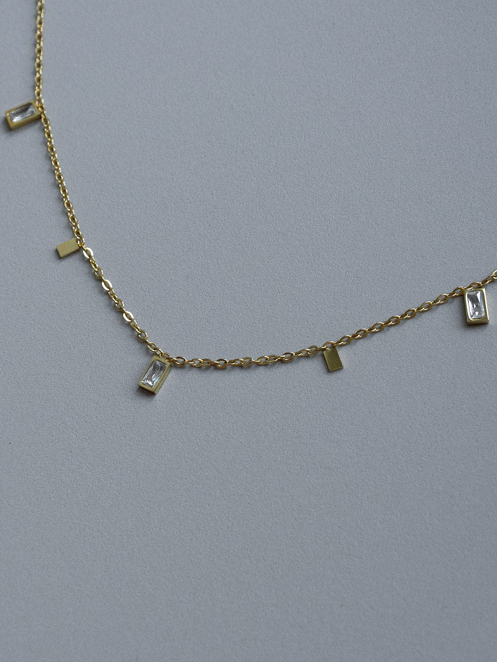 NEWA delicate, gold-plated stainless steel necklace featuring a series of rectangular-cut gemstones that bring sparkle and brilliance to a modern design.