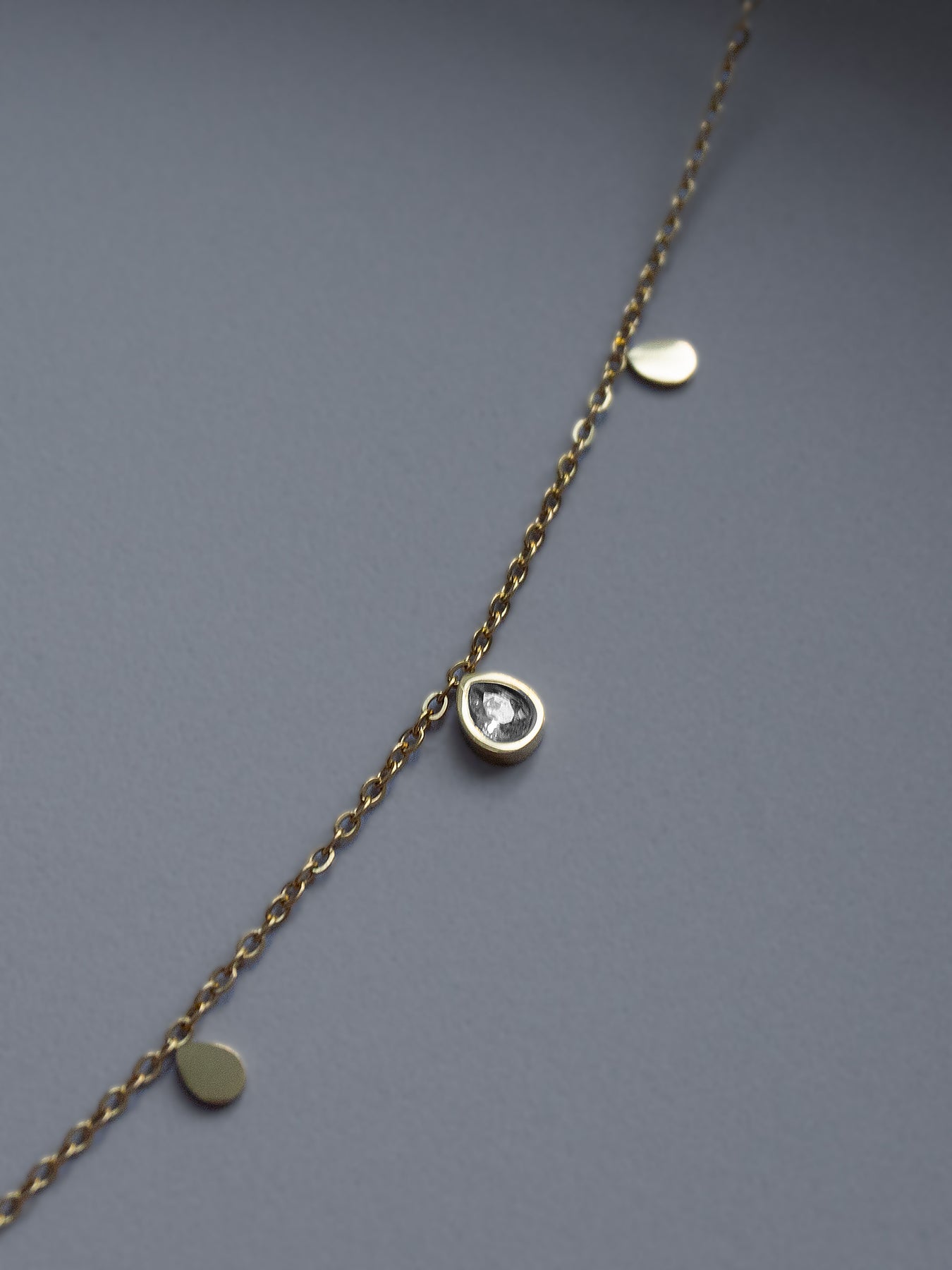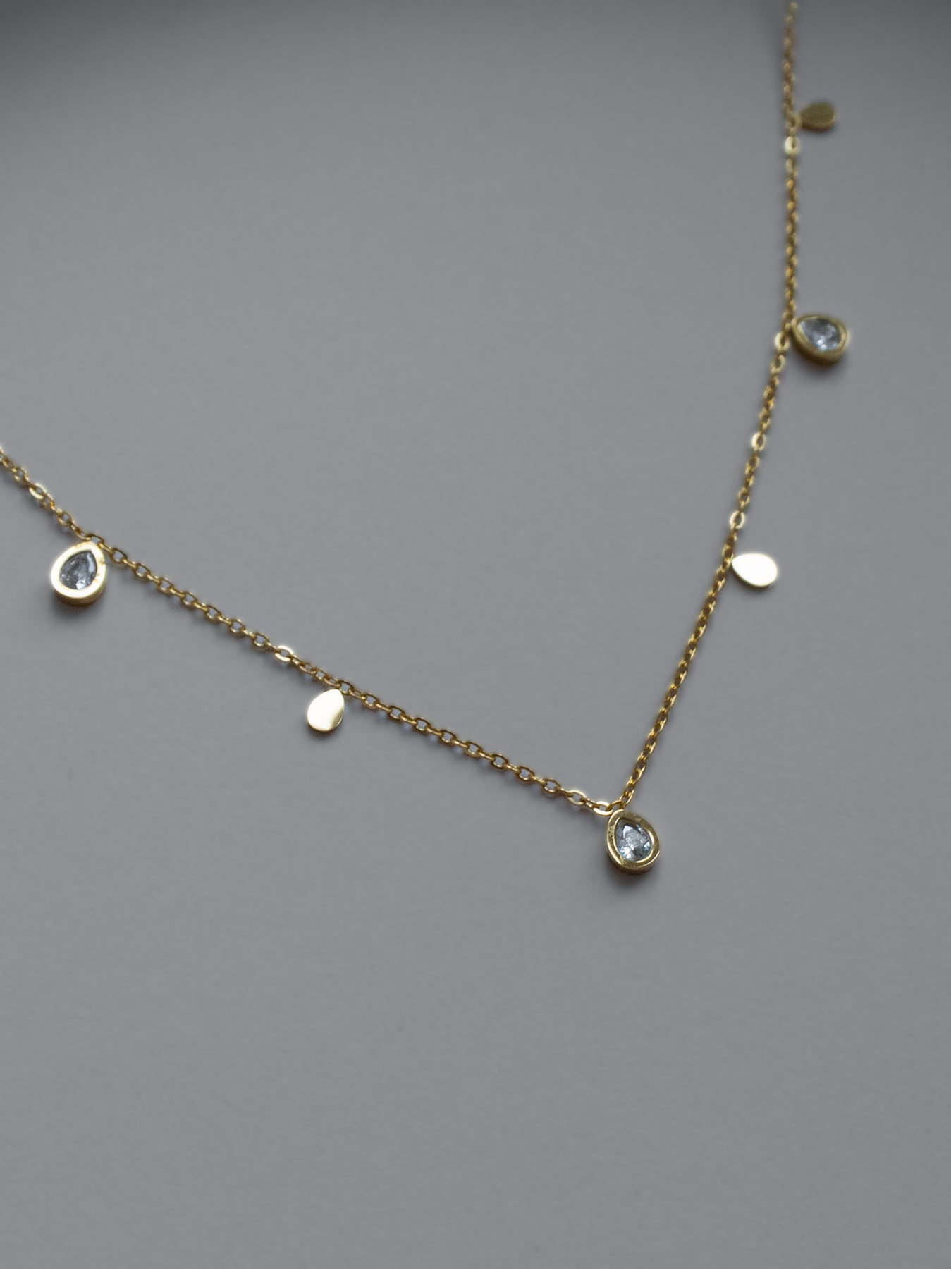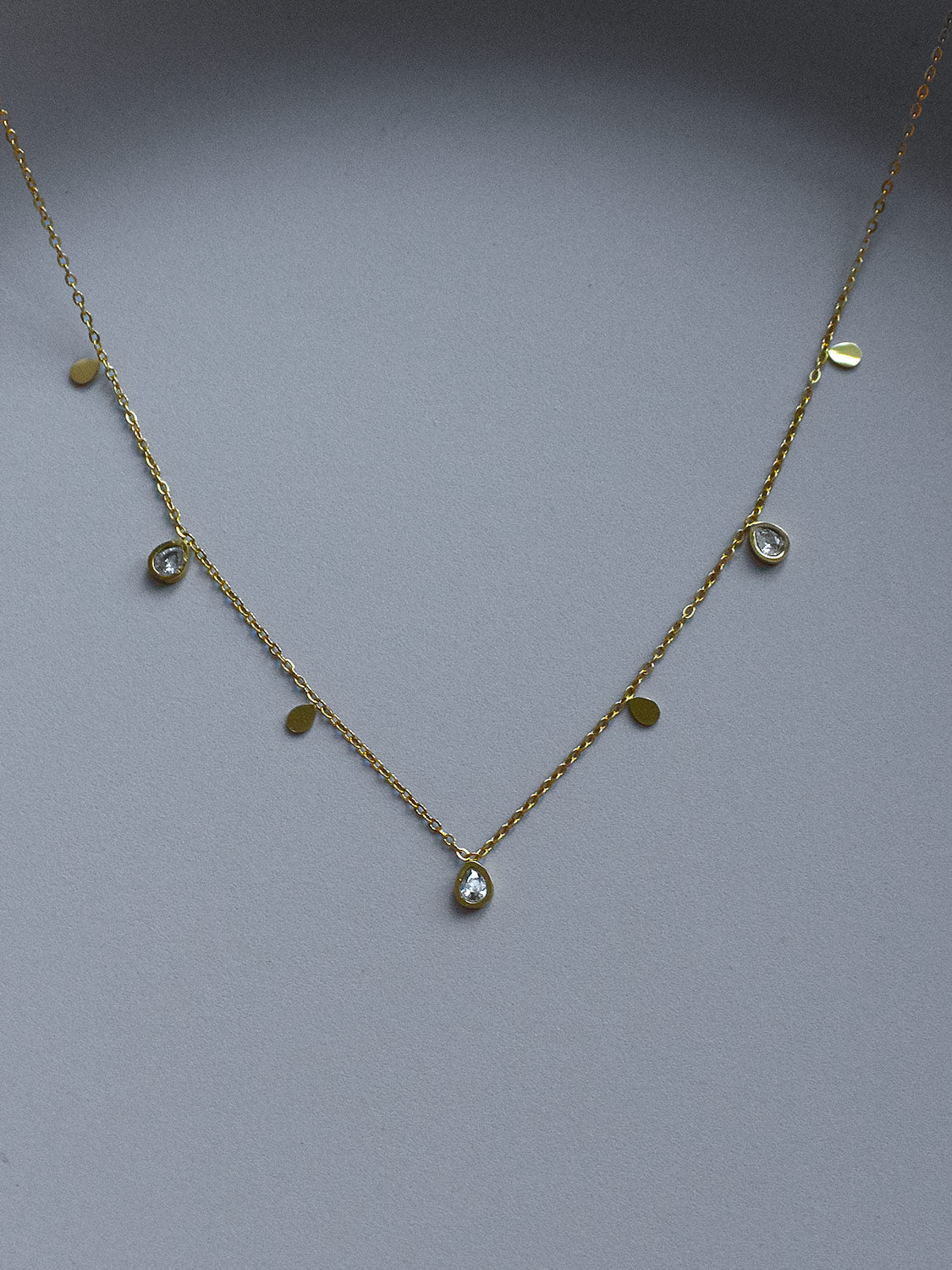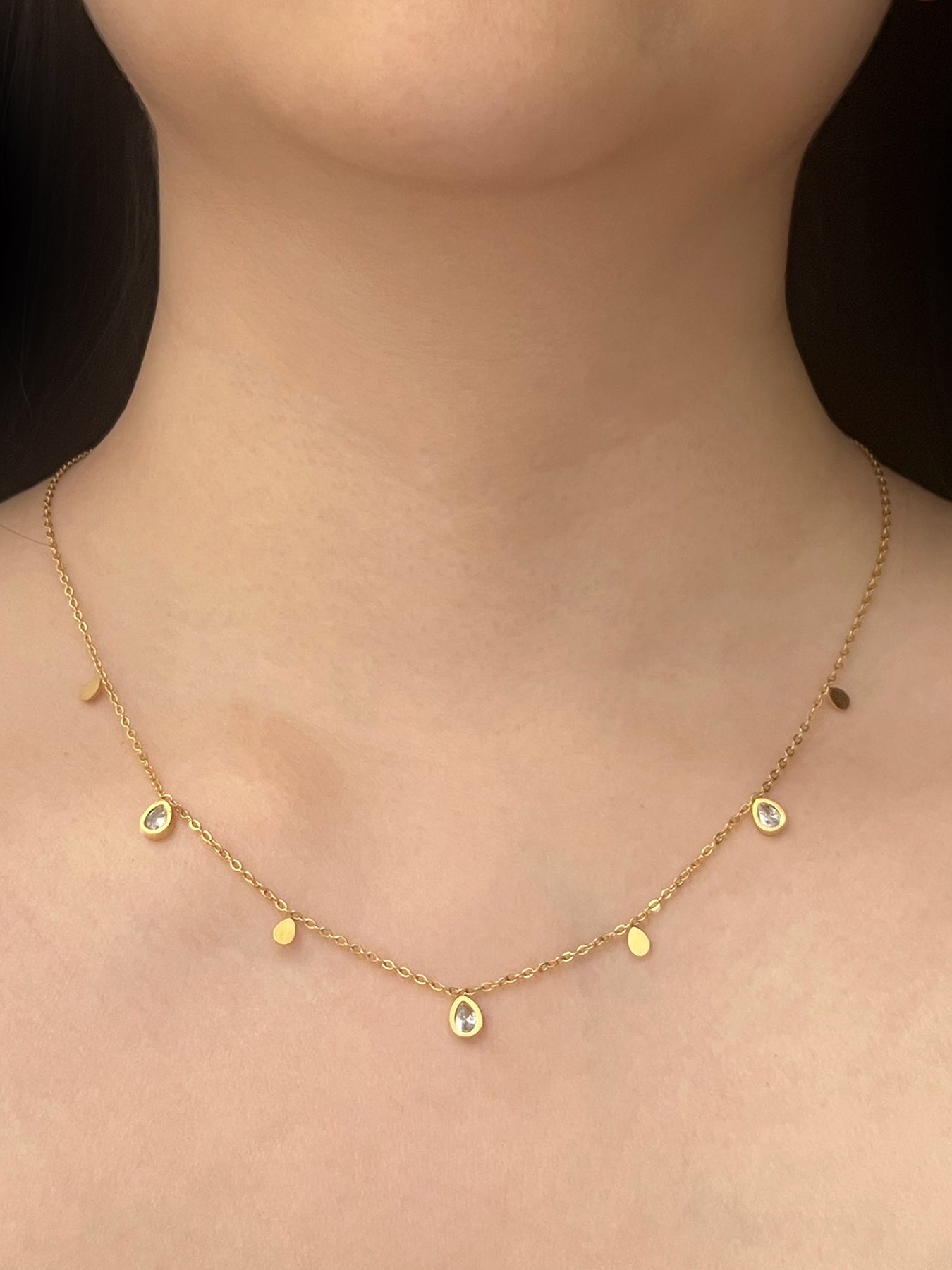 NEWA dainty gold-plated necklace featuring a delicately sparkling array of teardrop-shaped gemstones.
