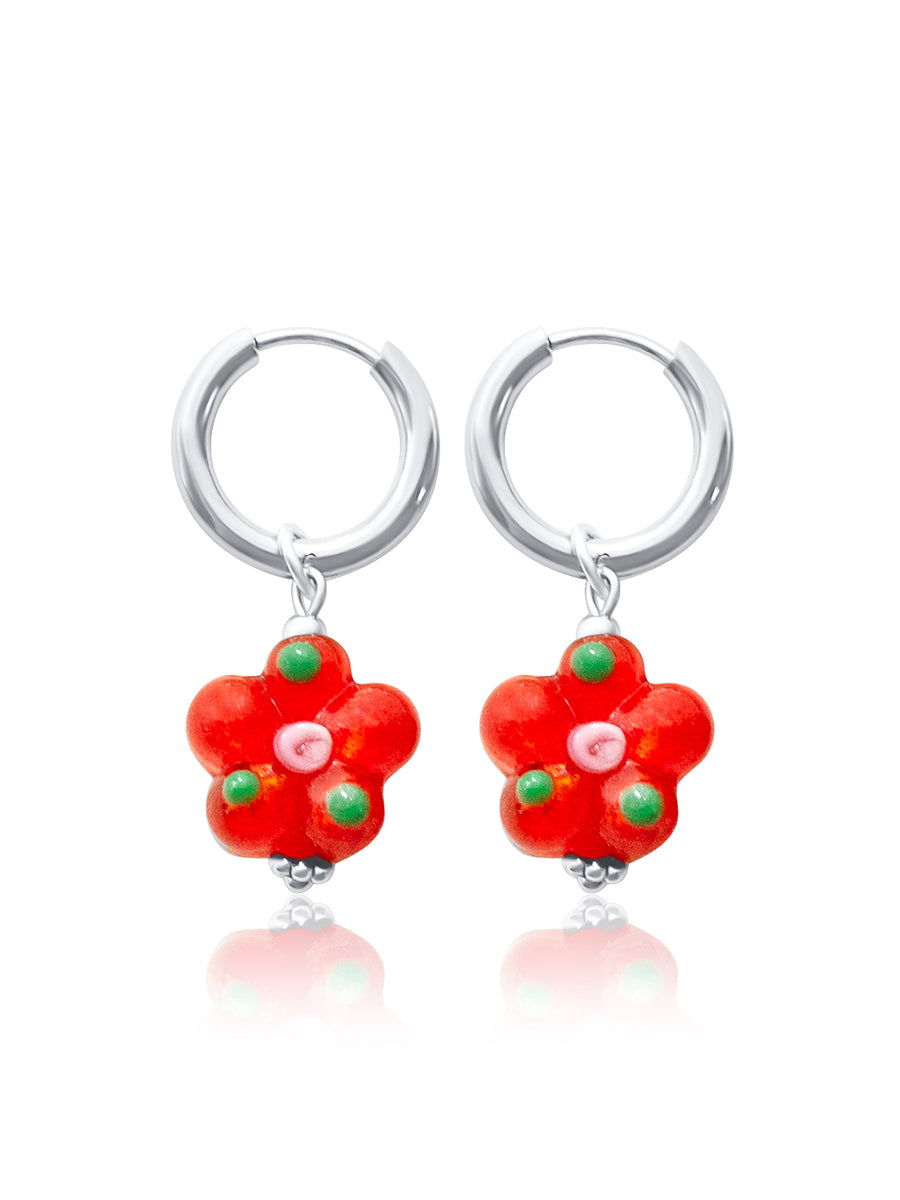 Delicate yet playful, these silver hoops bloom with bright orange glass flowers — a fresh, romantic twist on a timeless silhouette. Available in 4 colours, and in Gold.