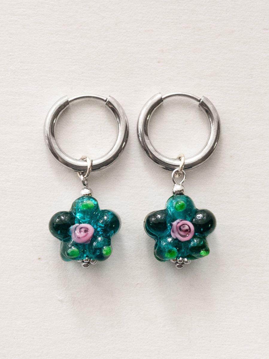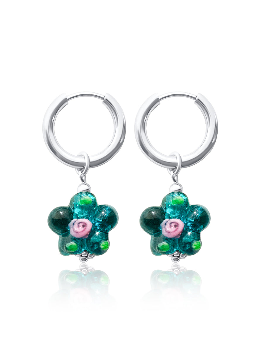 Delicate yet playful, these silver hoops bloom with vibrant teal-green glass flowers — a fresh, romantic twist on a timeless silhouette. Available in 4 colours, and in Gold.