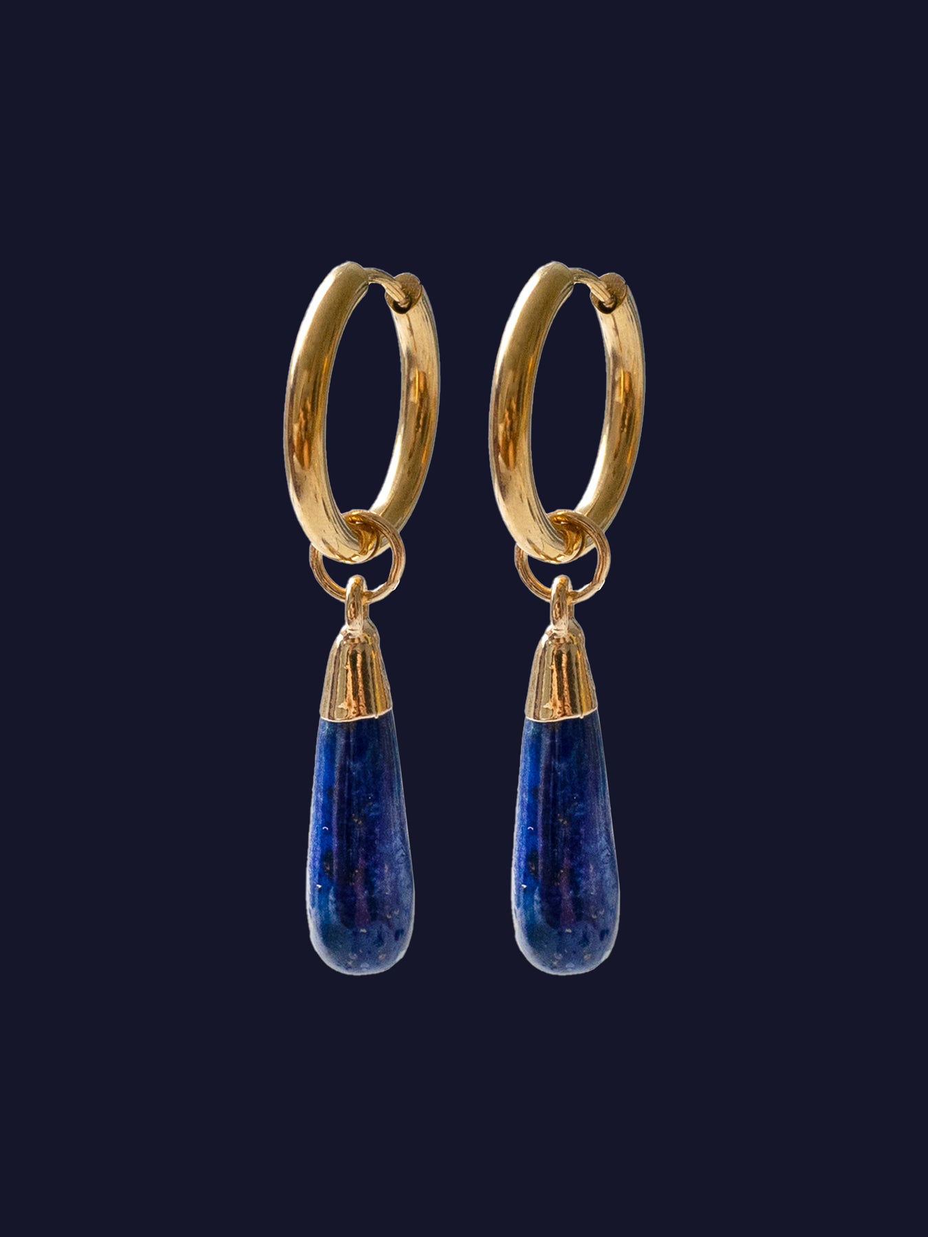 NOUVEAUNatural stones shaped like falling droplets lend each hoop graceful movement, while casting a soft, fluid glow. These hoops feature deep blue Lapis Lazuli, a talisman of wisdom, intuition, and serene power. Shop its matching Flow Stone Necklace here.