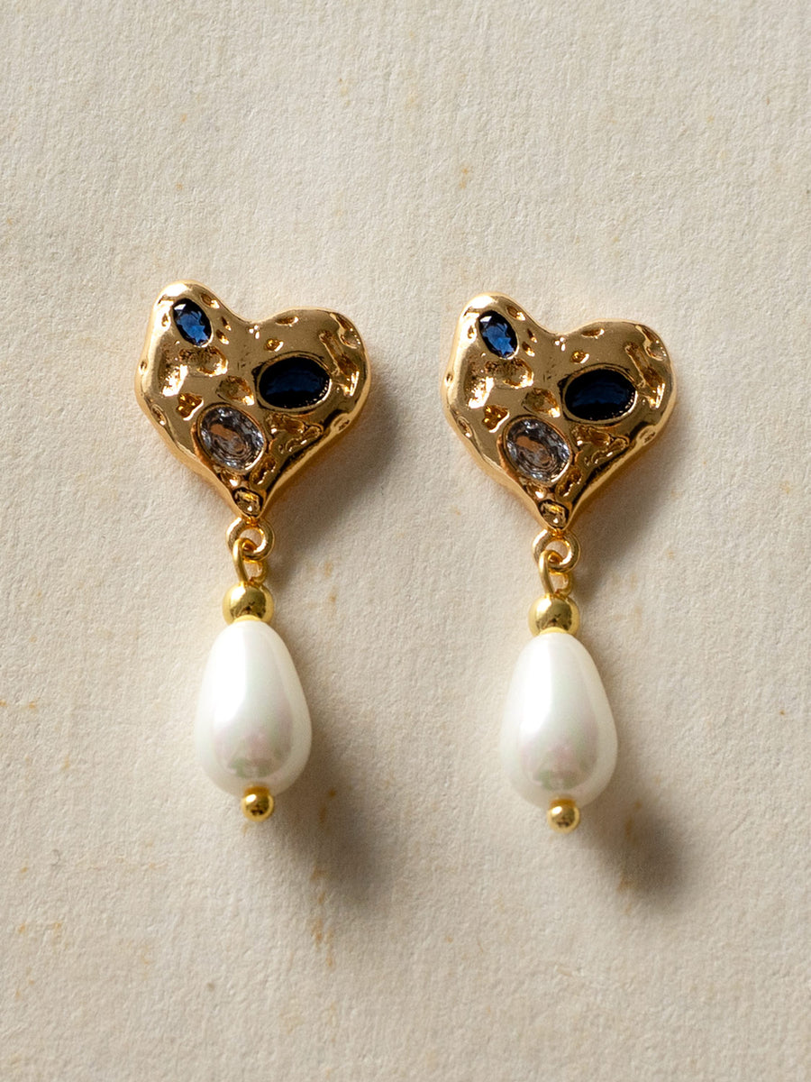 Small baroque heart earstuds shimmering with blue gemstones and a soft teardrop pearl accent.