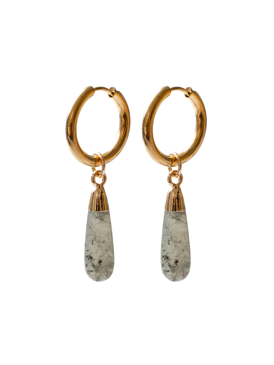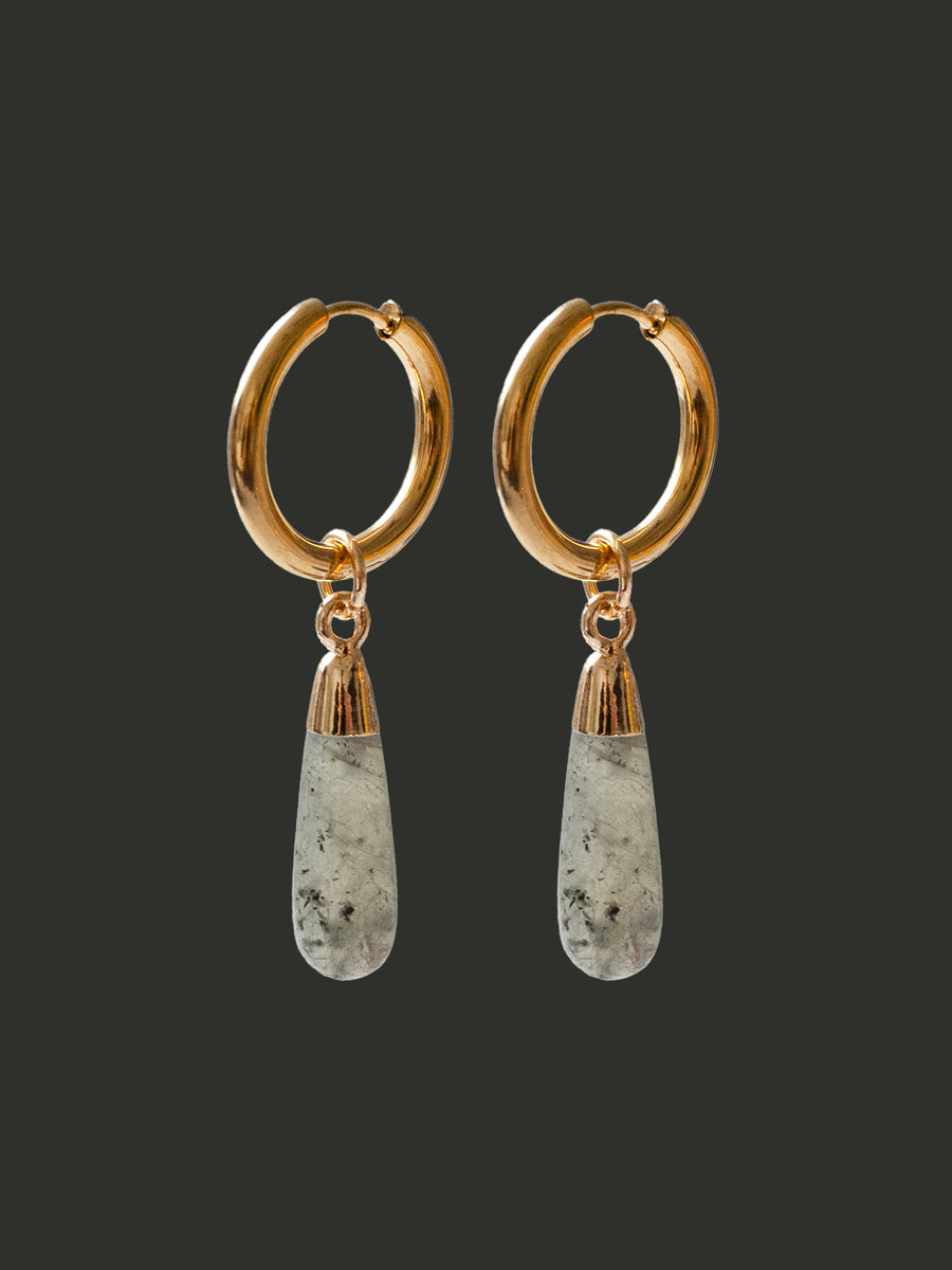 Natural stones shaped like falling droplets lend each hoop graceful movement, while casting a soft, fluid glow. Shop its matching Flow Stone Necklace here.