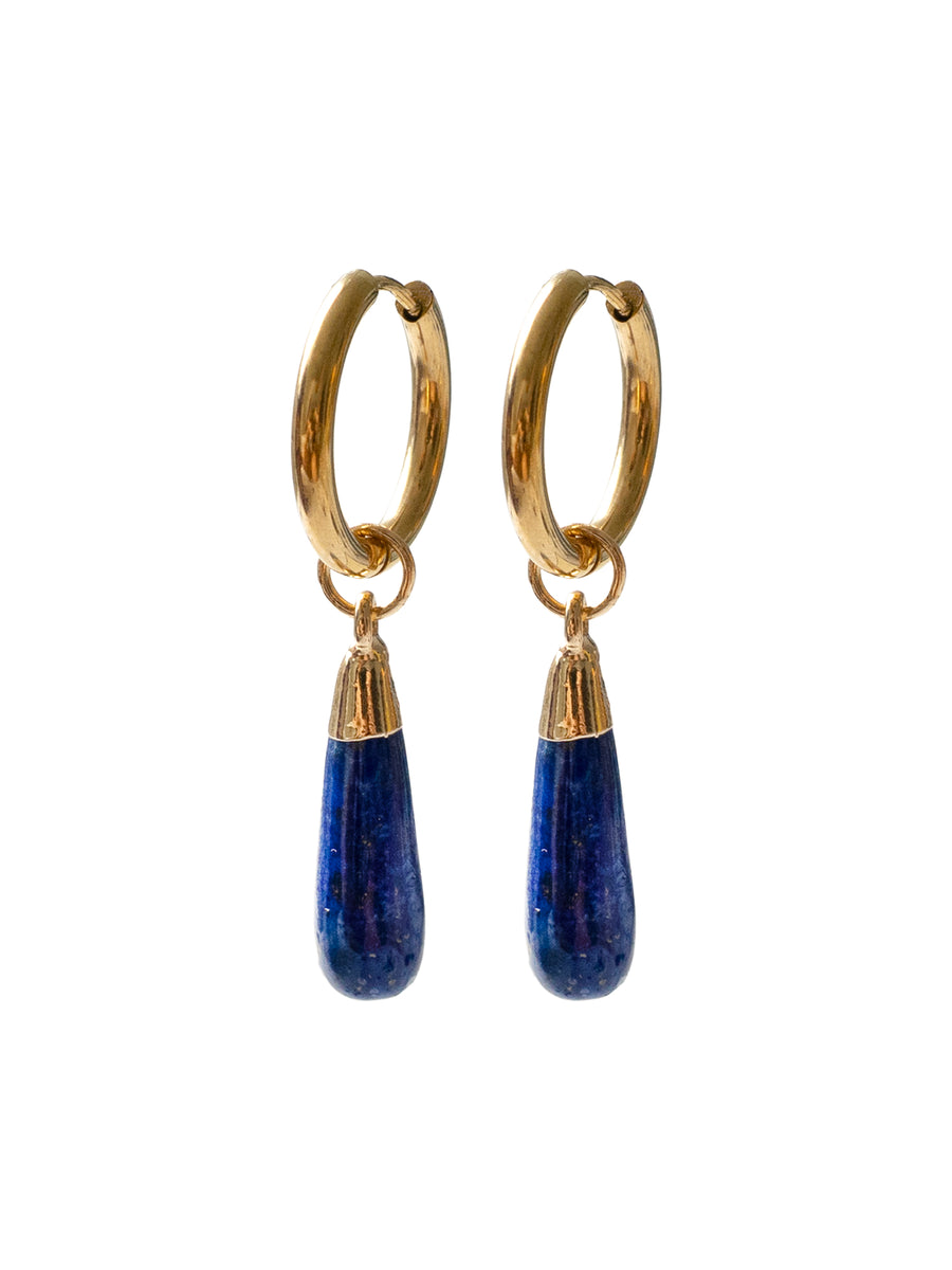 Natural stones shaped like falling droplets lend each hoop graceful movement, while casting a soft, fluid glow. These hoops feature deep blue Lapis Lazuli, a talisman of wisdom, intuition, and serene power. Shop its matching Flow Stone Necklace here.