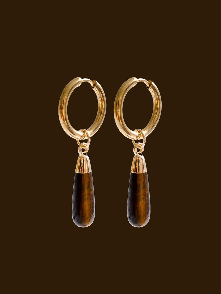 Natural stones shaped like falling droplets lend each hoop graceful movement, while casting a soft, fluid glow. These hoops feature Tiger Eye, the stone of courage and clarity. Shop its matching Flow Stone Necklace here.