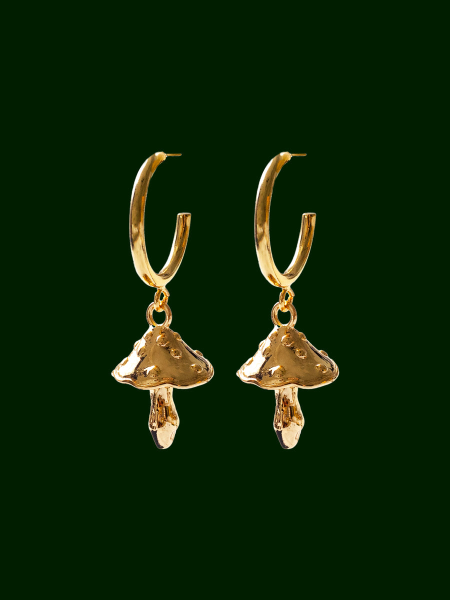 Whimsical gold hoops featuring mushroom charms for sweet, fairy-garden charm.