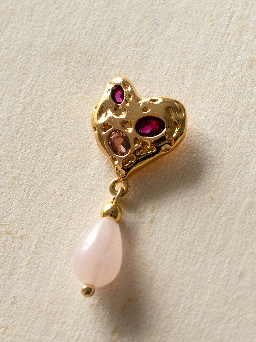 Small baroque heart earstuds shimmering with pink gemstones and a soft rose quartz teardrop accent.