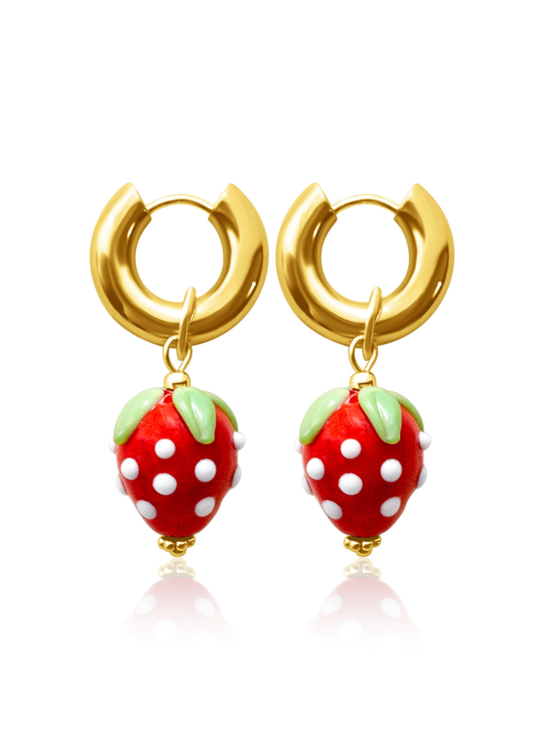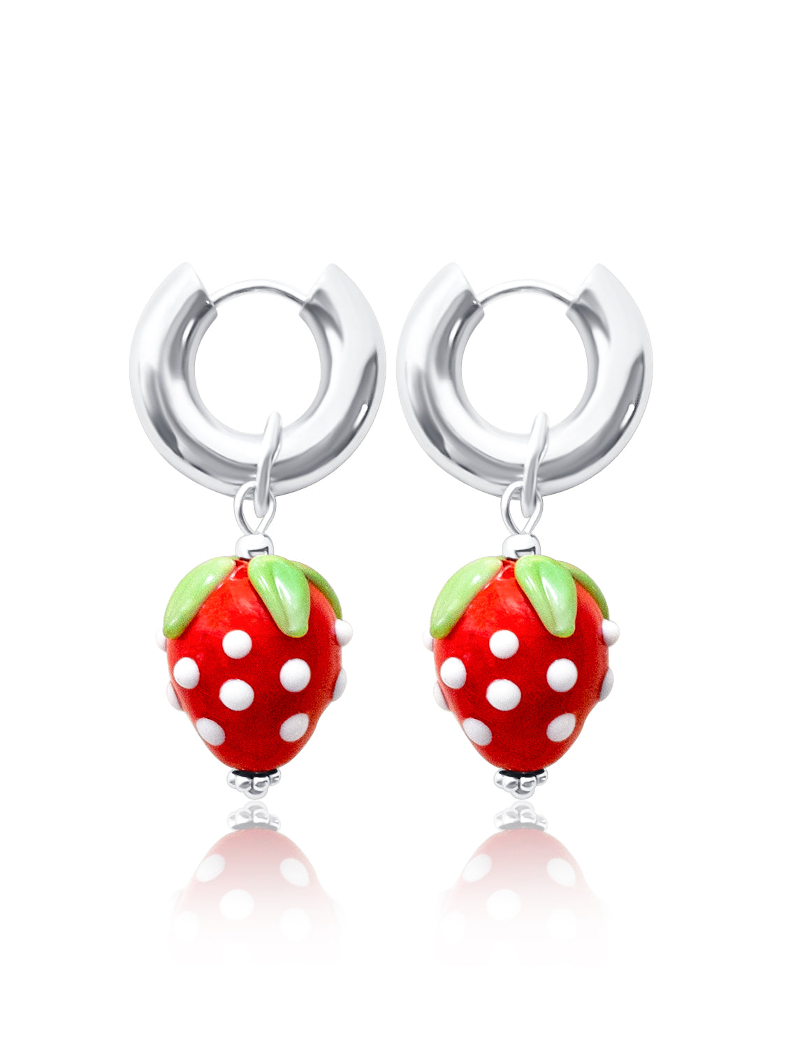 Sweet and vibrant, these silver hoops are adorned with glossy red glass strawberries — a playful nod to nature’s charm and carefree indulgence. Also available in Gold.