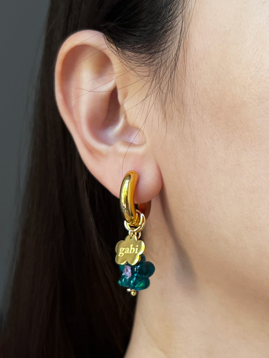 Bold yet feminine, these chunky gold hoops feature a charming glass flower and our signature Gabi Flower pendant — a carved emblem of our brand’s timeless, artful spirit. Little note on Glass Flower: please allow for slight variations in colour, tone and shape due to photography lighting, and the handmade nature of charms.