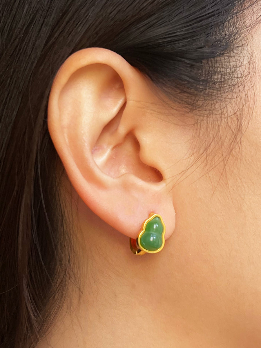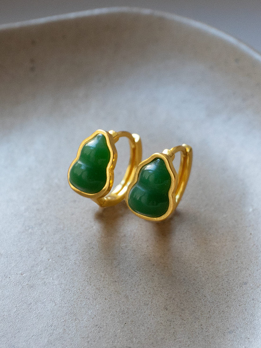 Symbolic, intricately carved gold hoops featuring jade gourd stones and delicate pearl drops.
