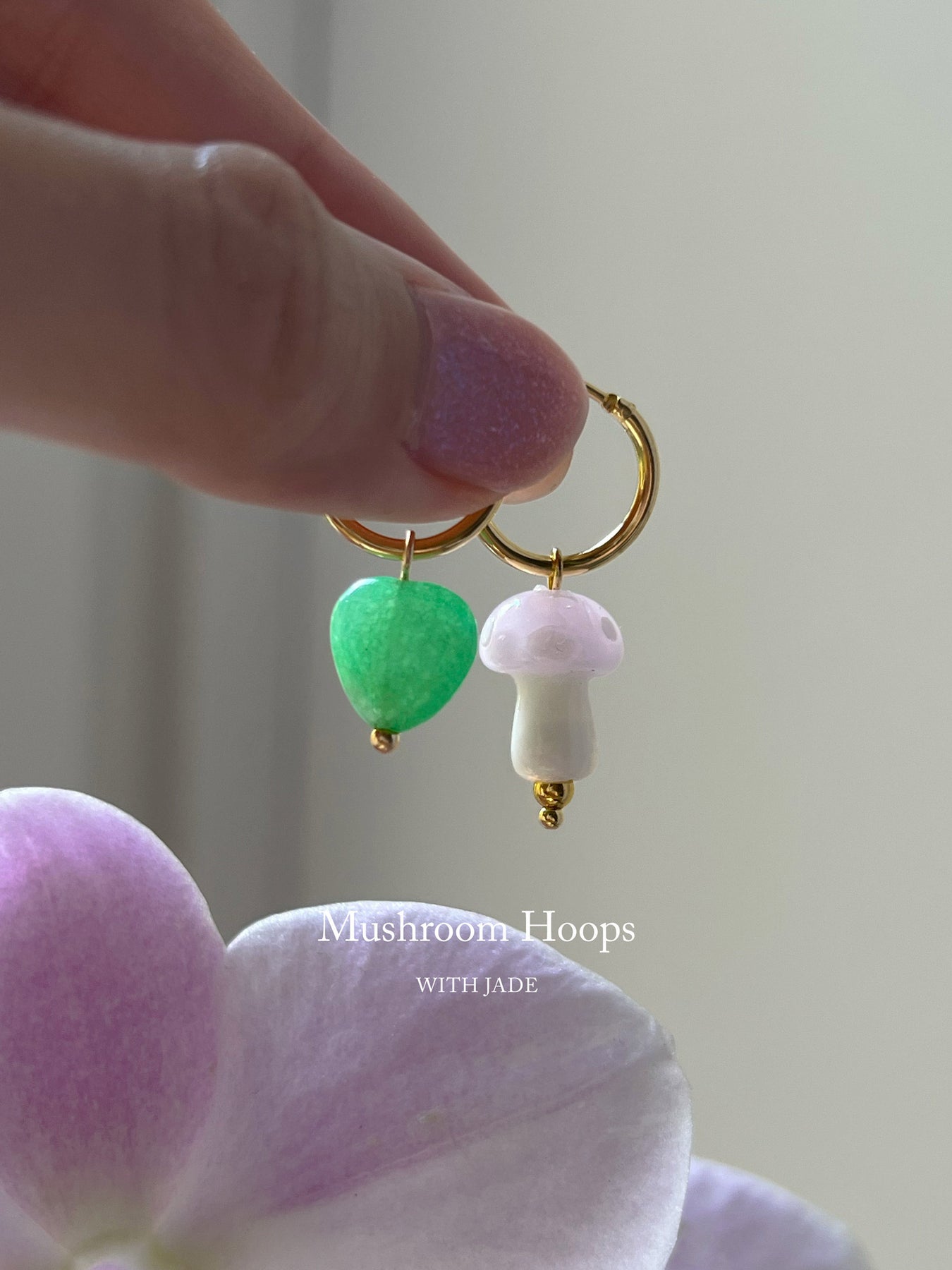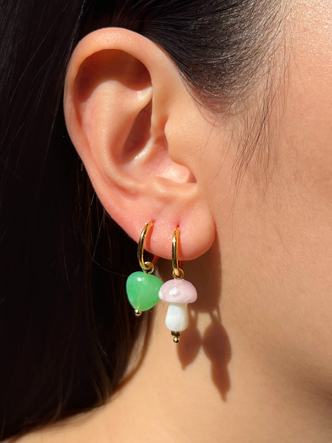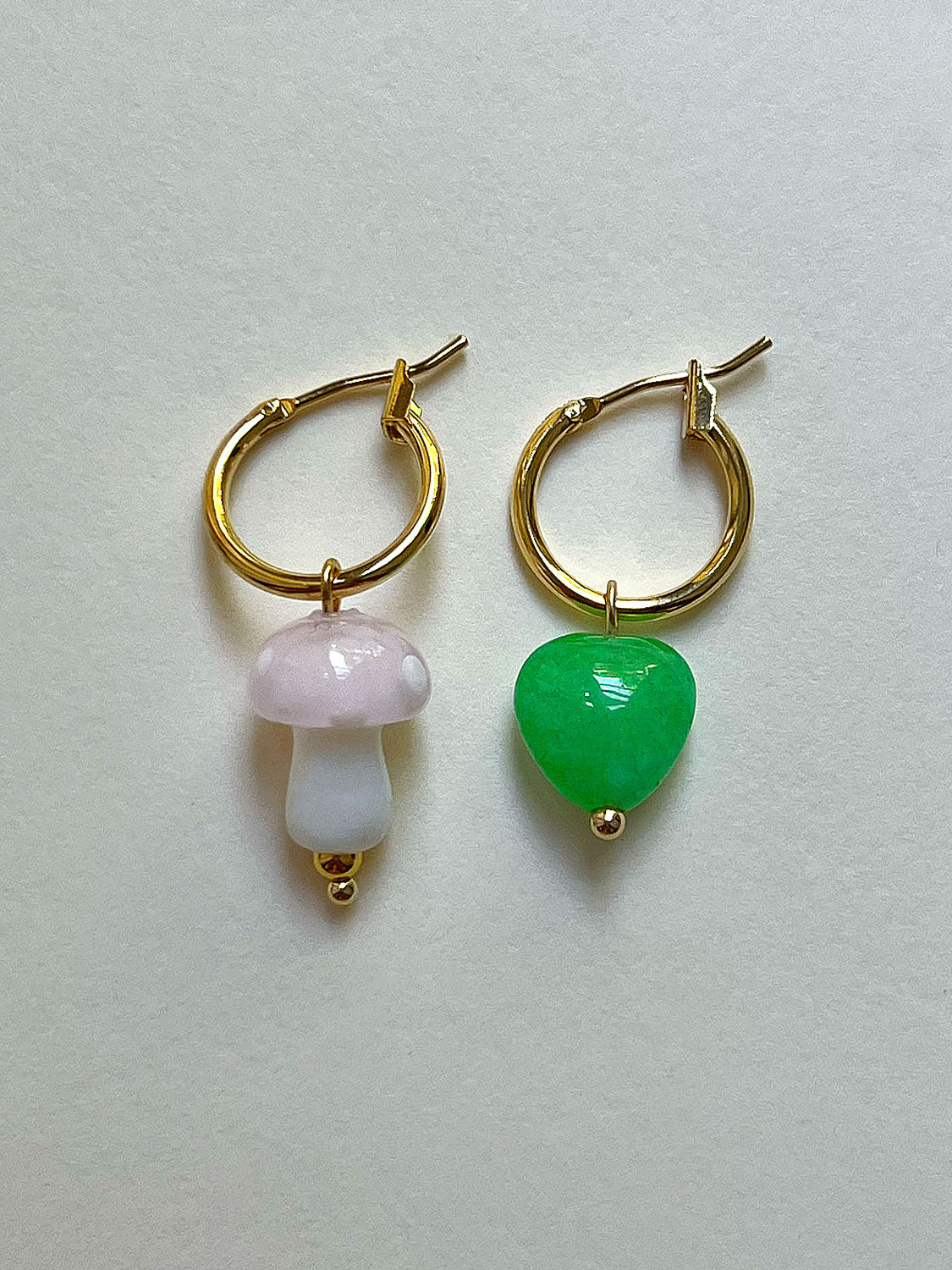 Ajoutez une touche de fantaisie à votre look de tous les jours avec nos créoles champignons en verre dépareillées super mignonnes ! Associé à un cristal de jade vert clair en forme de cœur.