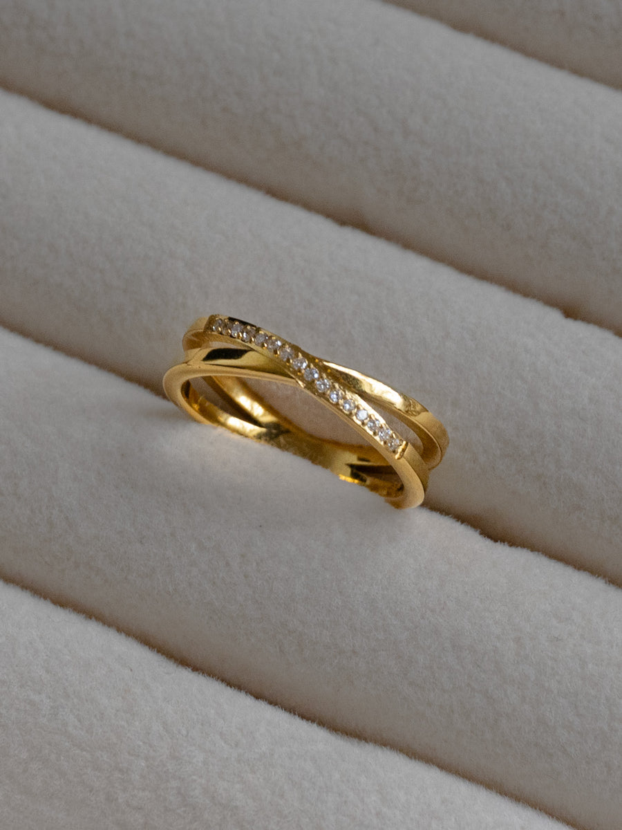 A delicate wavy gold band set with sparkling gemstones — sleek, modern, and effortlessly versatile. Also available in Silver.