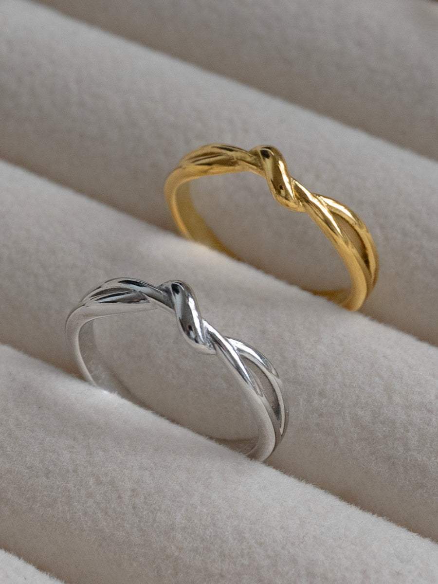 A sleek silver stainless steel band tied in a delicate knot — a timeless symbol of connection and strength. Also available in Gold.