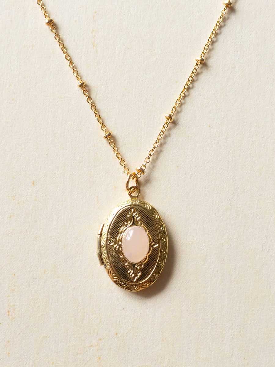 A rose quartz stone nestled in the heart of an oval locket, radiating love and gentle energy.