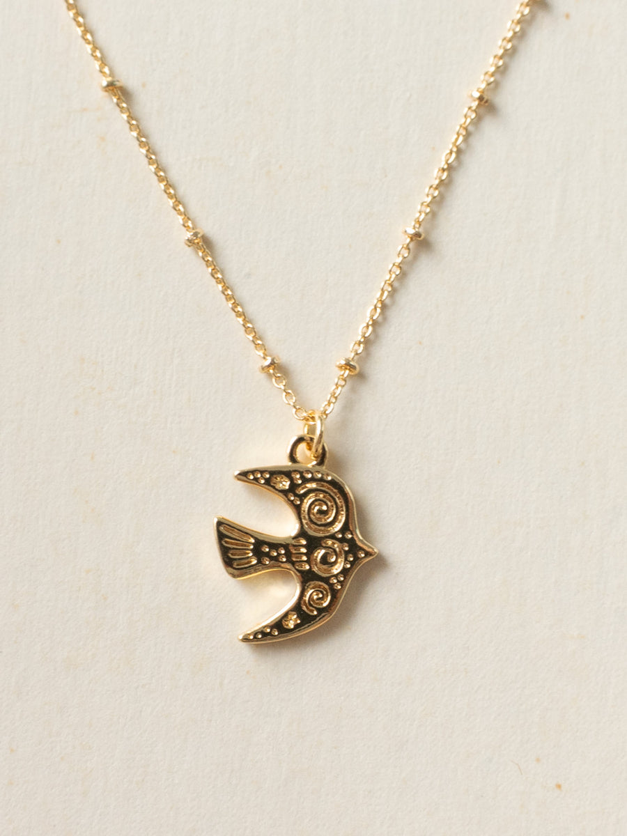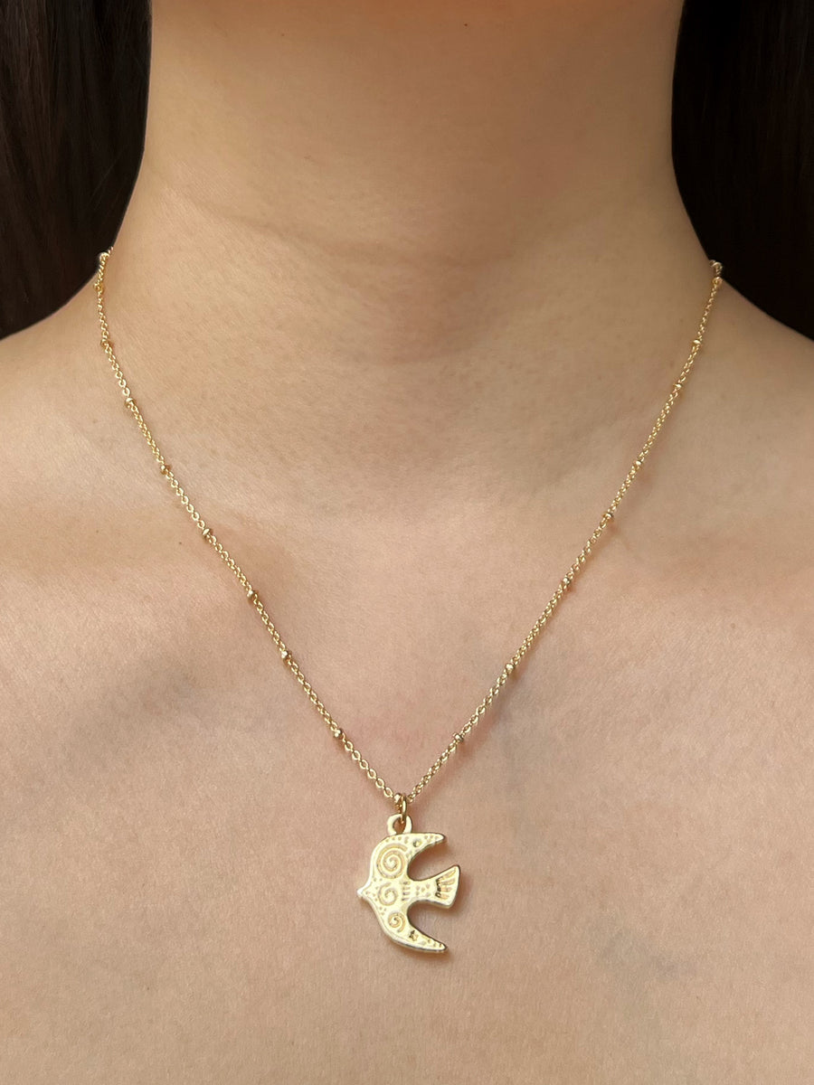 A delicate gold necklace with a carved dove, representing tranquility, love, and quiet renewal. Also available in Gentle Elephant and Intuitive Horse.