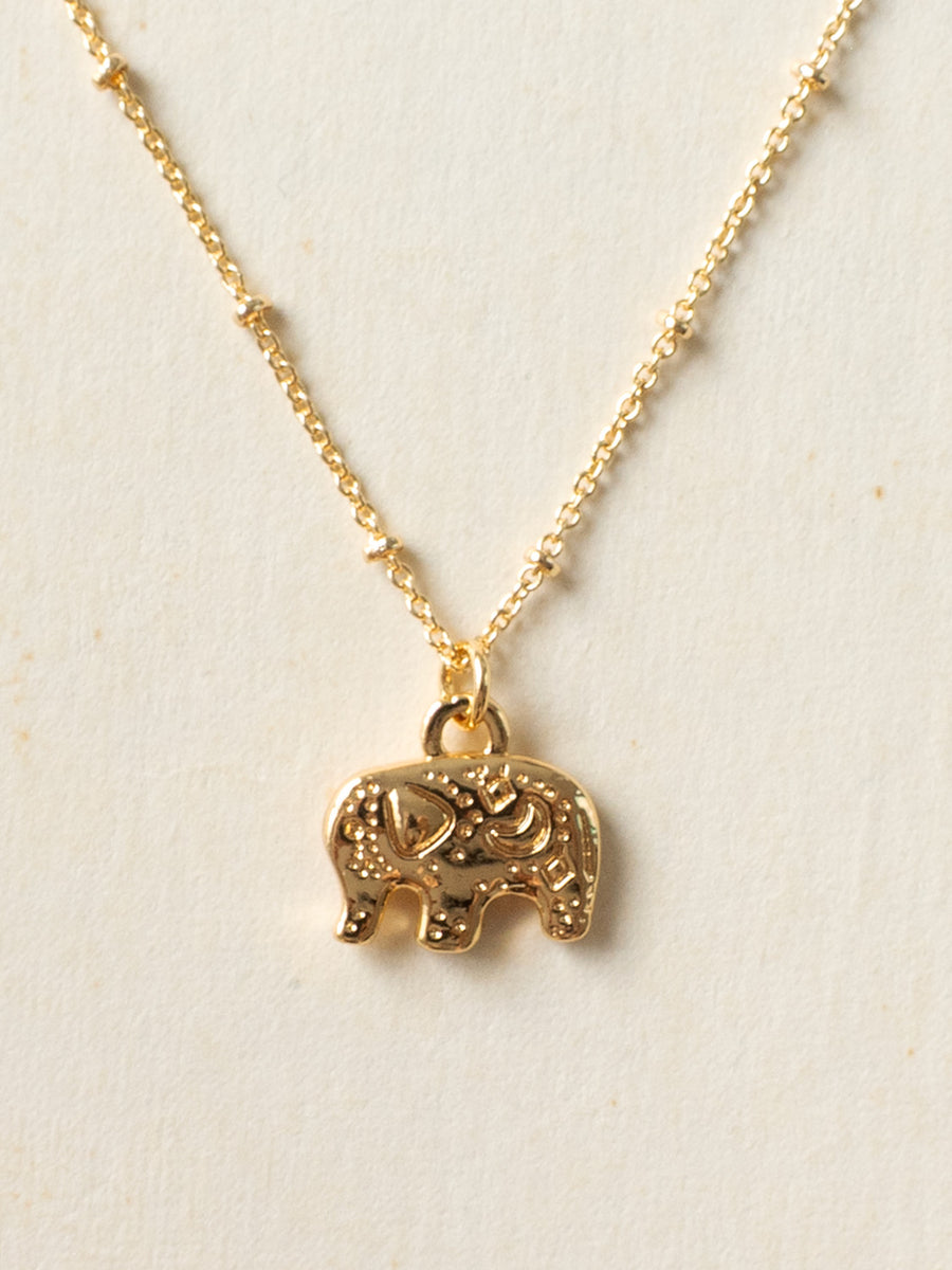 A delicate gold necklace with a carved elephant, embodying wisdom, strength, and gentle guardianship. Also available in Peaceful Dove and Intuitive Horse.
