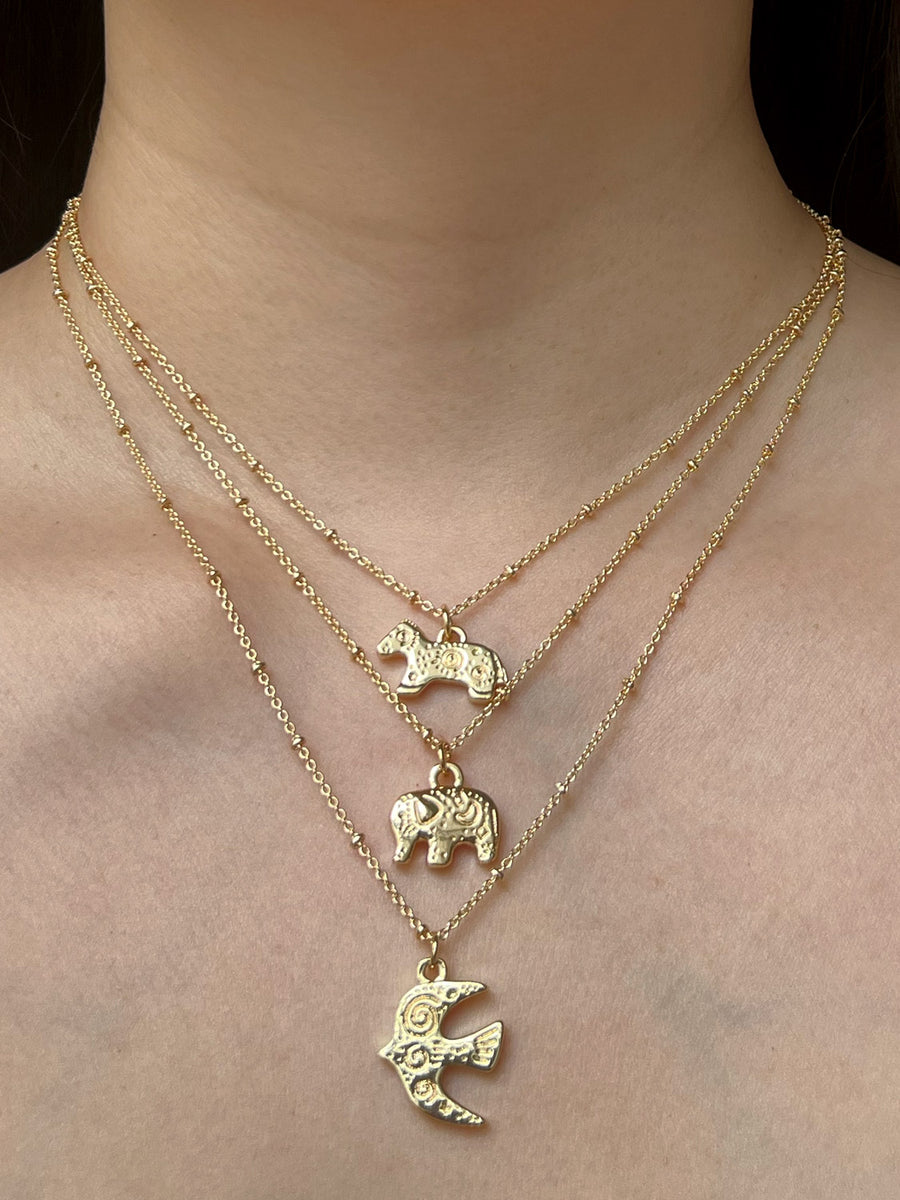 A delicate gold necklace with a carved horse, a symbol of intuition, freedom, and inner strength. Also available in Gentle Elephant and Peaceful Dove.