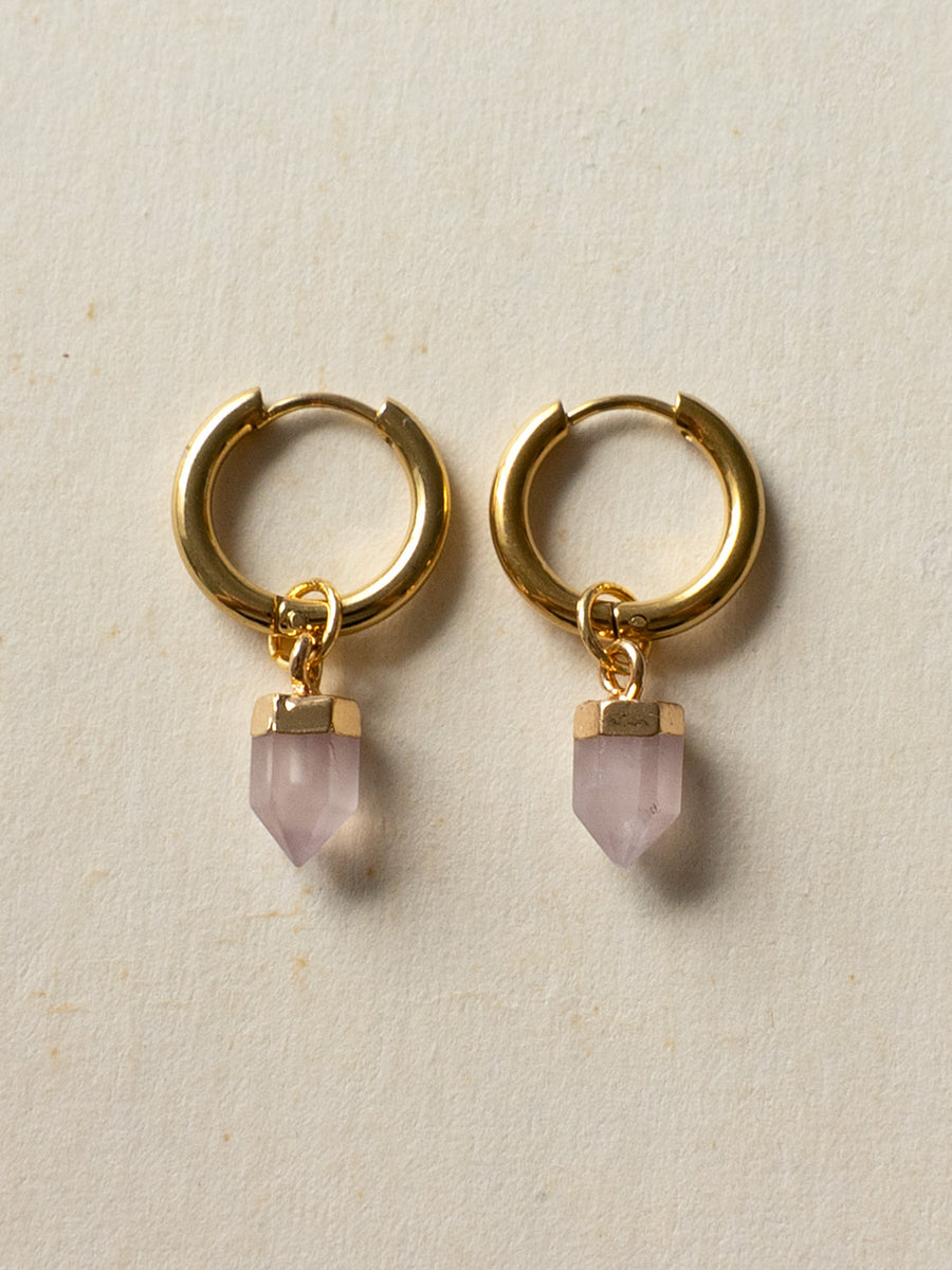 These natural stone crystal hoops soft Rose Quartz, a symbol of love, compassion, and gentle heart energy.