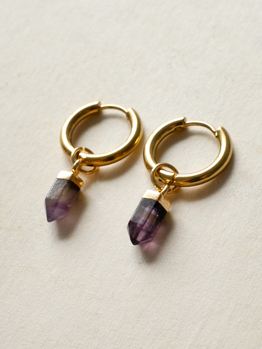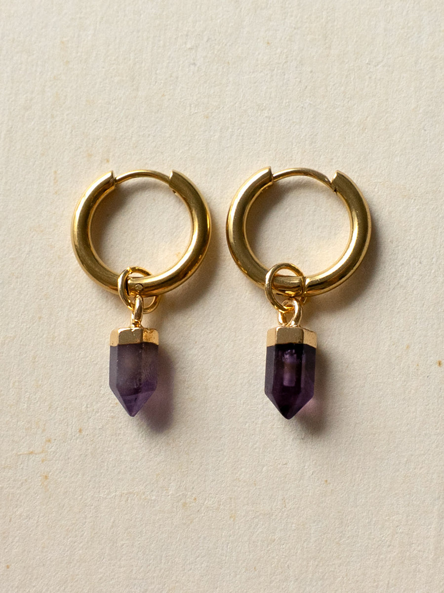 These natural stone crystal hoops feature rich Amethyst Purple stone, a charm of insight, spiritual clarity, and quiet strength.
