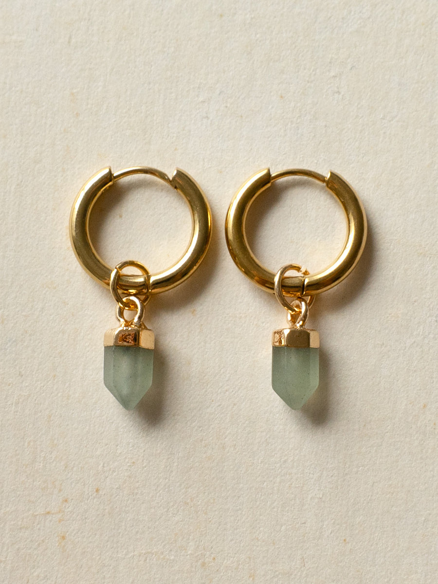 These natural stone crystal hoops feature soothing Green Aventurine, embodying growth, renewal, and grounded harmony.
