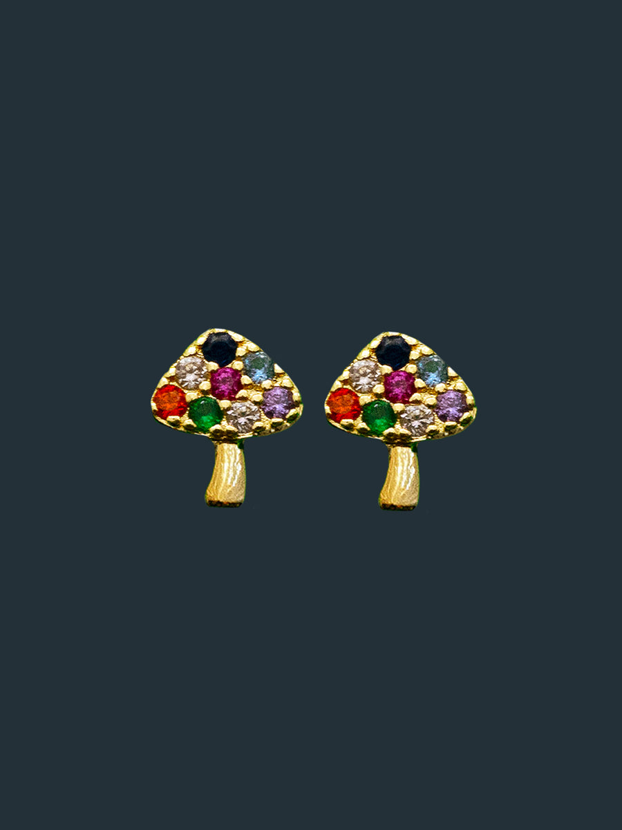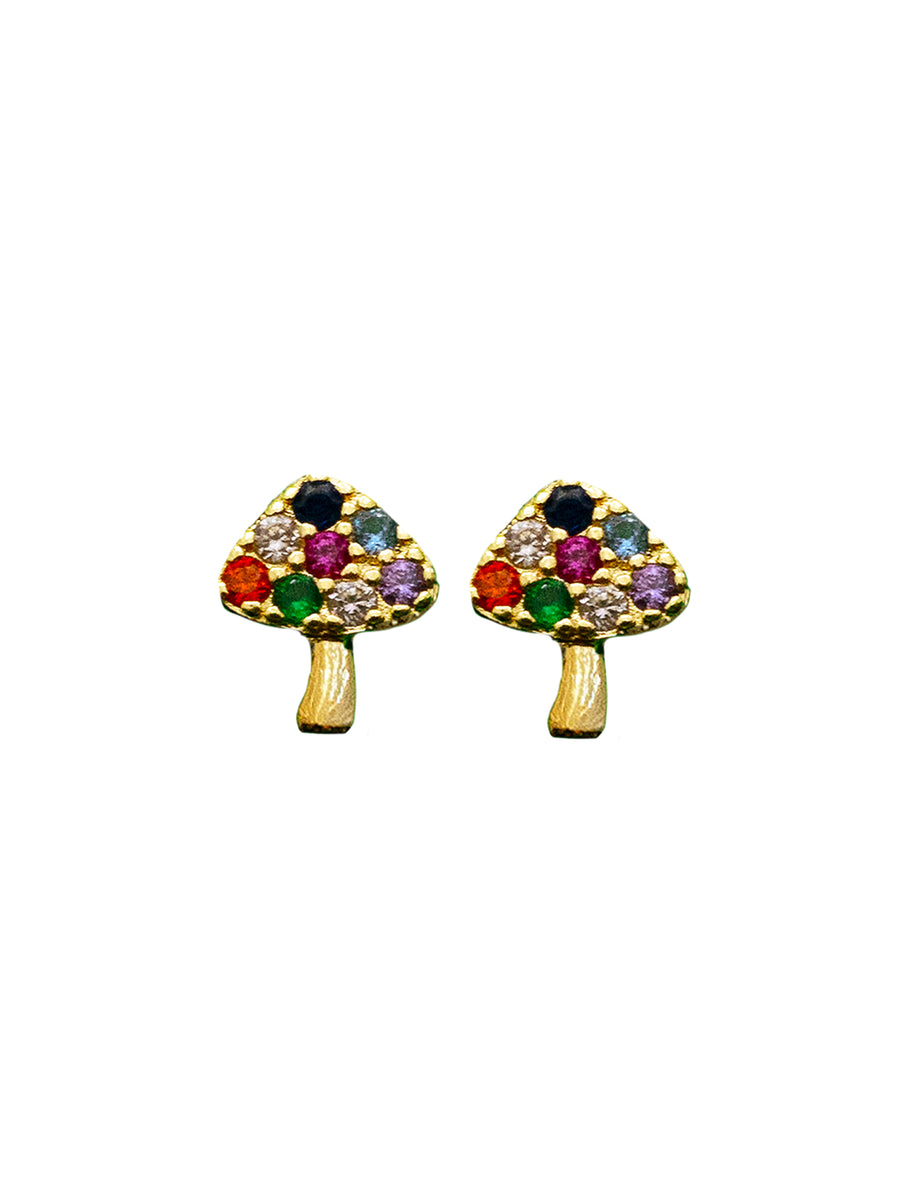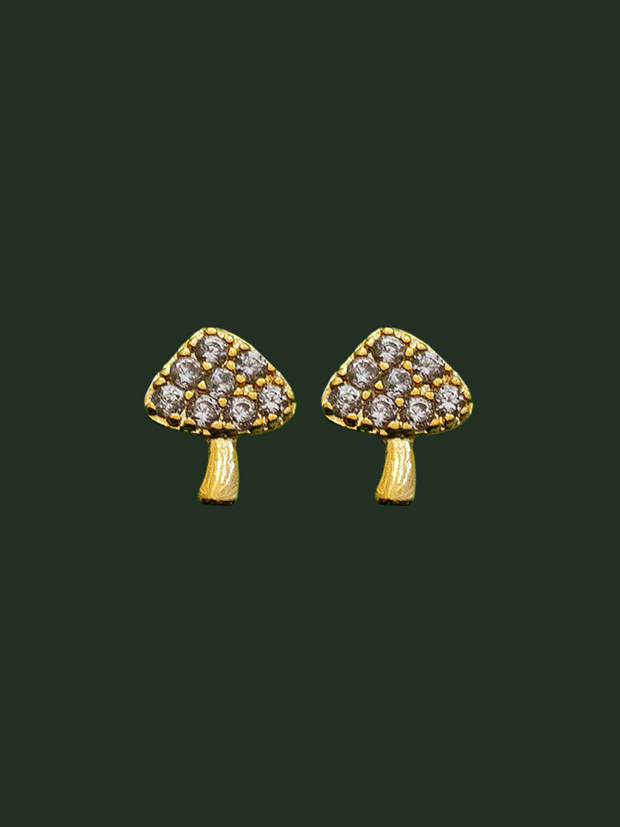 Whimsical mushroom earstuds in gold-plated S925 silver, featuring clear gemstones for a light-catching finish. Also available in Multi-colour.